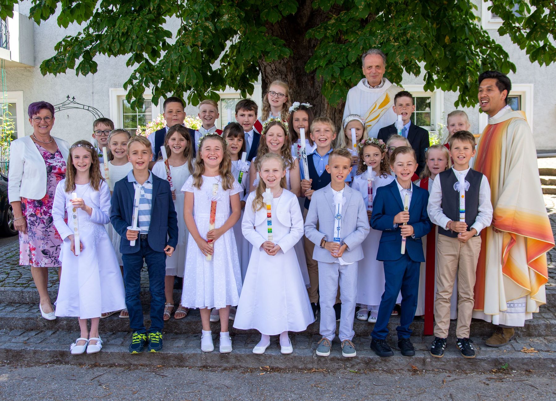 33 Kinder aus der Pfarrgemeinde Schönering empfingen am Samstag, 18. Juni 2022 zum ersten Mal die heilige Kommunion. Ihre Erstkommunionfeier wurde aufgrund von Corona vom Vorjahr auf das heurige Jahr verschoben.