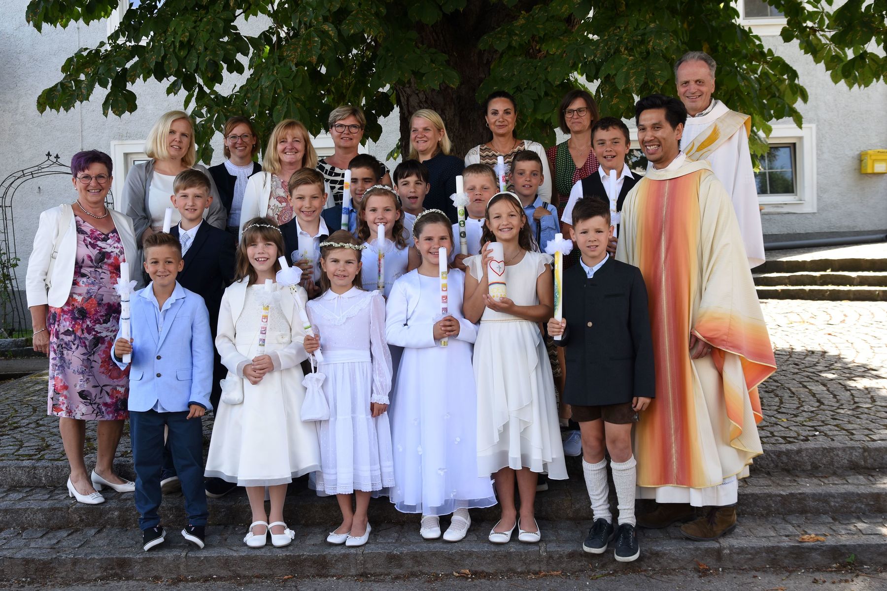 Erstkommunionkinder der 3b Klasse mit Pater Dominik und Frau Rosa Zölß