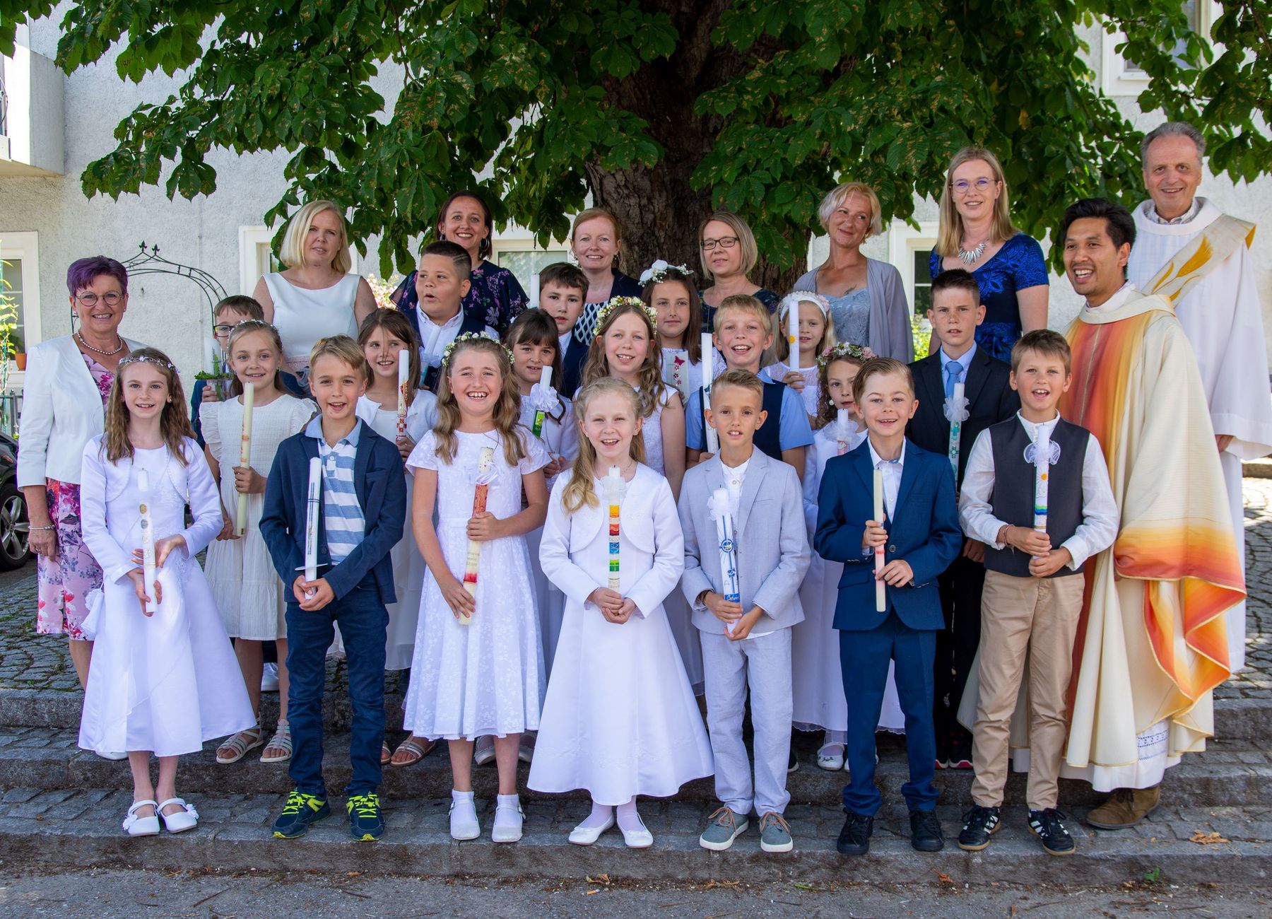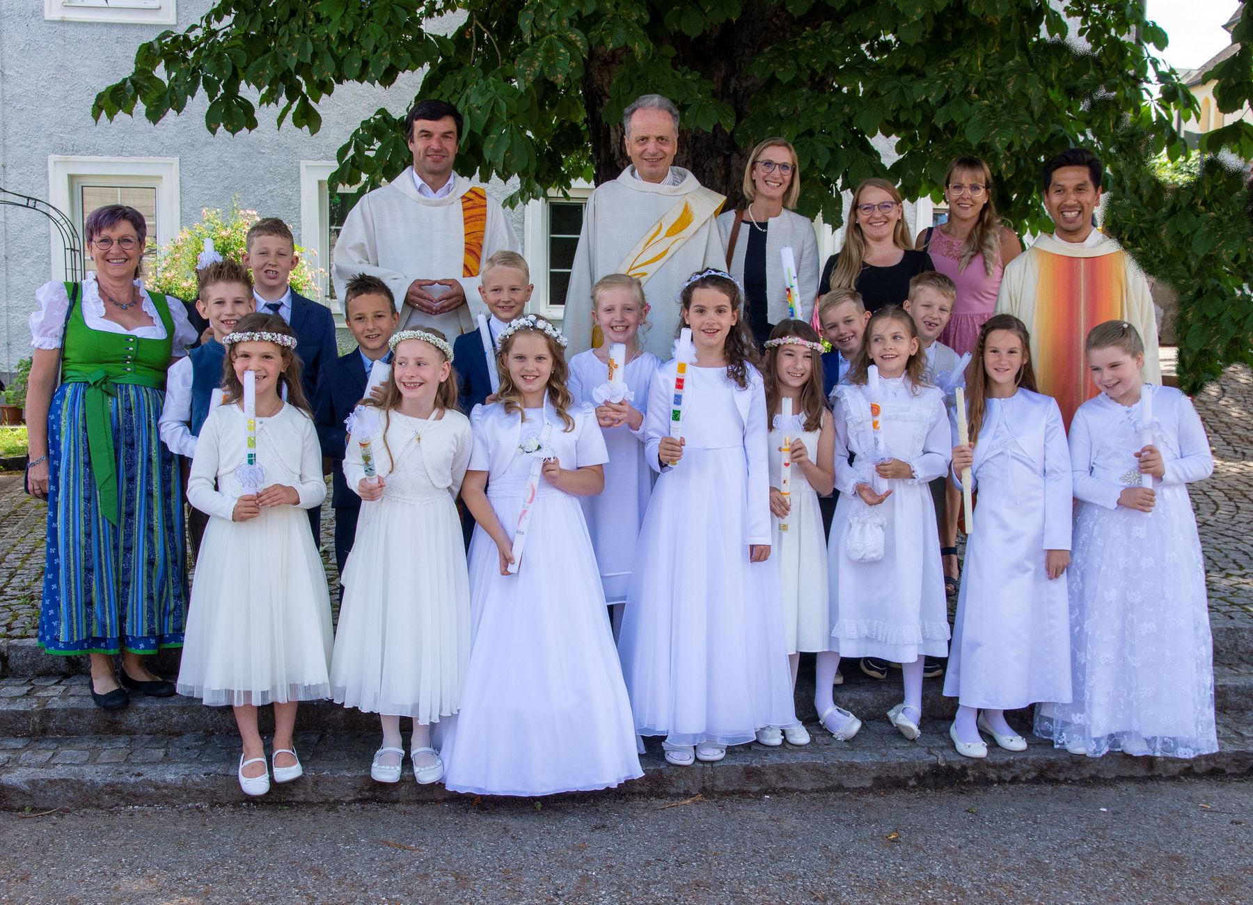29 Kinder aus der Pfarrgemeinde Schönering empfingen am Samstag, 11. Juni 2022 zum ersten Mal die heilige Kommunion. Sie wurden damit in die Mahlgemeinschaft aufgenommen.