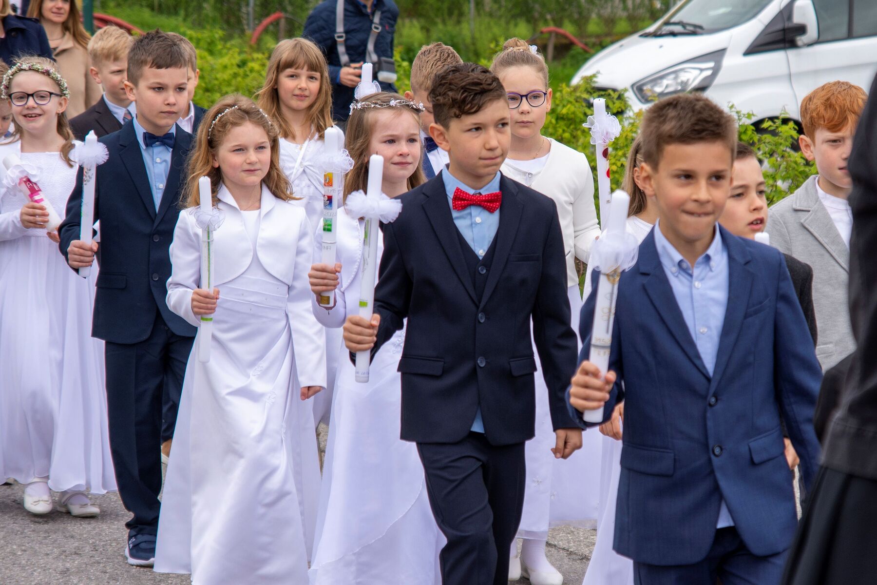 Die Taufpatinnen und Taufpaten begrüßten die Erstkommunionkinder beim Kirchenaufgang mittels Spalier, und so zogen die Kinder feierlich in die Kirche ein.
