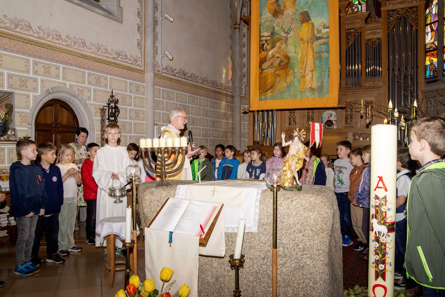 Sigrid Glemba freut sich gemeinsam mit der Gottesdienstgemeinschaft, dass am 4. Mai 27 Buben und Mädchen die erste Heilige Kommunion bei uns in Schönering empfangen werden. Sie las die Namen der Erstkommunionkinder der 2a und 2b Klasse unserer Volksschule vor, die sich währenddessen im Altarraum versammelten. Sigrid bat Pfarrer Klaus, die schön verzierten Kerzen der Erstkommunionkinder zu segnen.