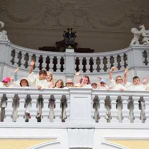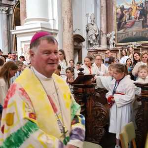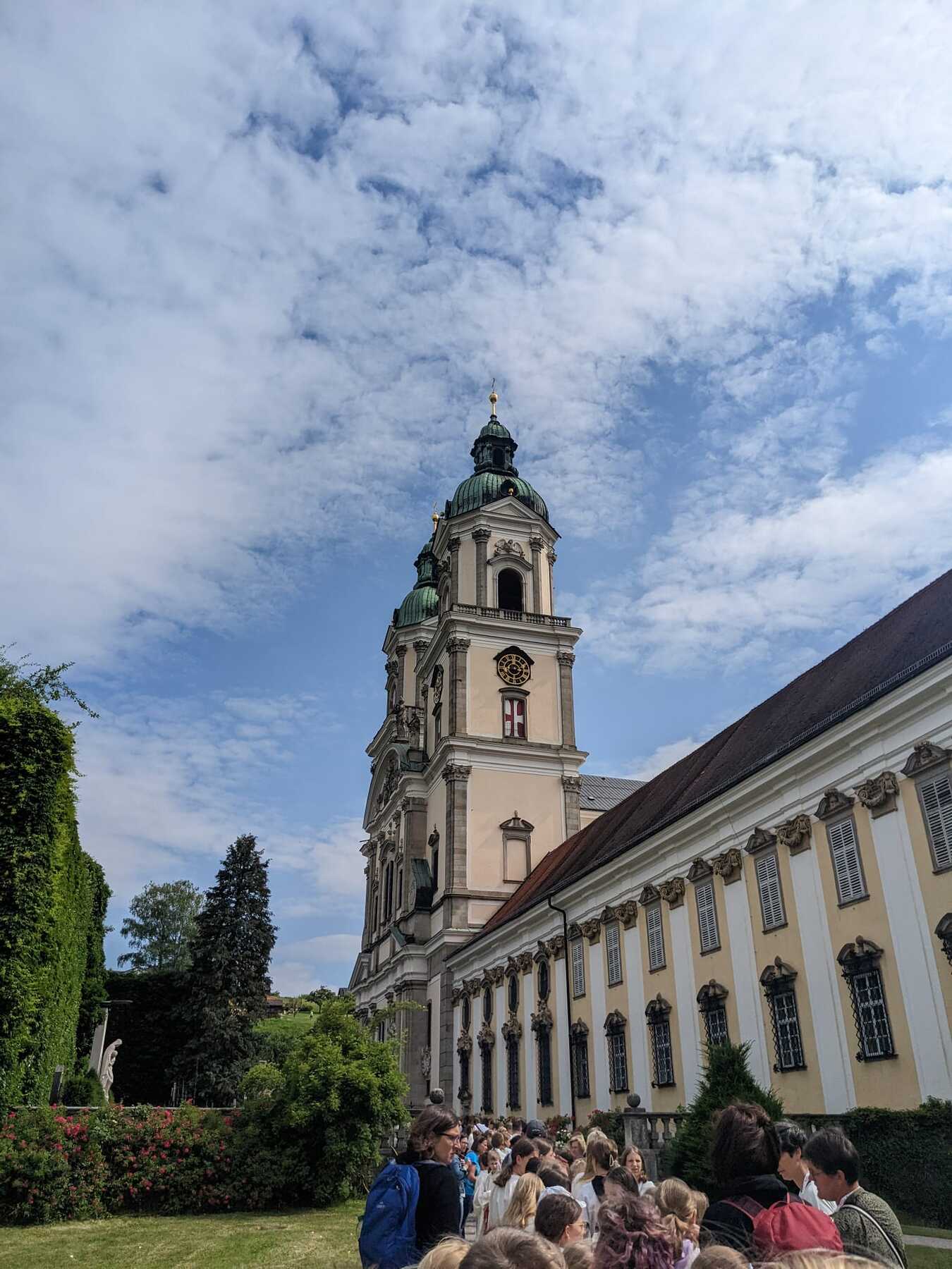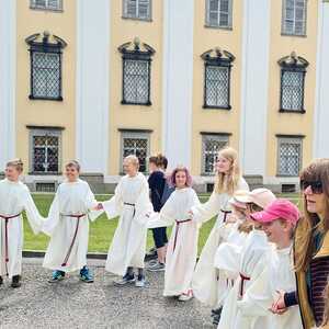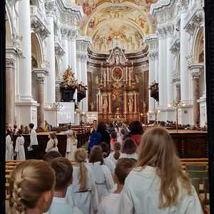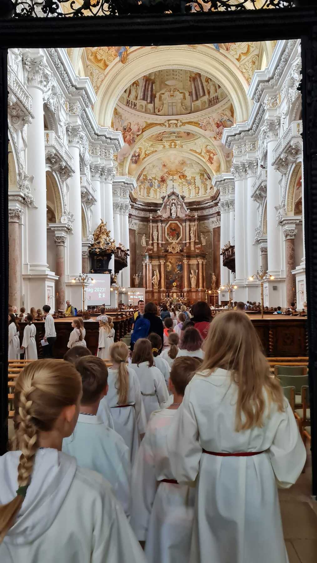 Nach der Anmeldung warfen sich die Minis gleich mal "in Schale" und stellten sich - gemeinsam mit 1200 anderen Ministrant*innen aus 90 Pfarrgemeinden - im Stiftspark zum gemeinsam Einzug in die Stiftskirche auf, um mit Bischof Manfred Scheuer den Gottesdienst zu feiern.