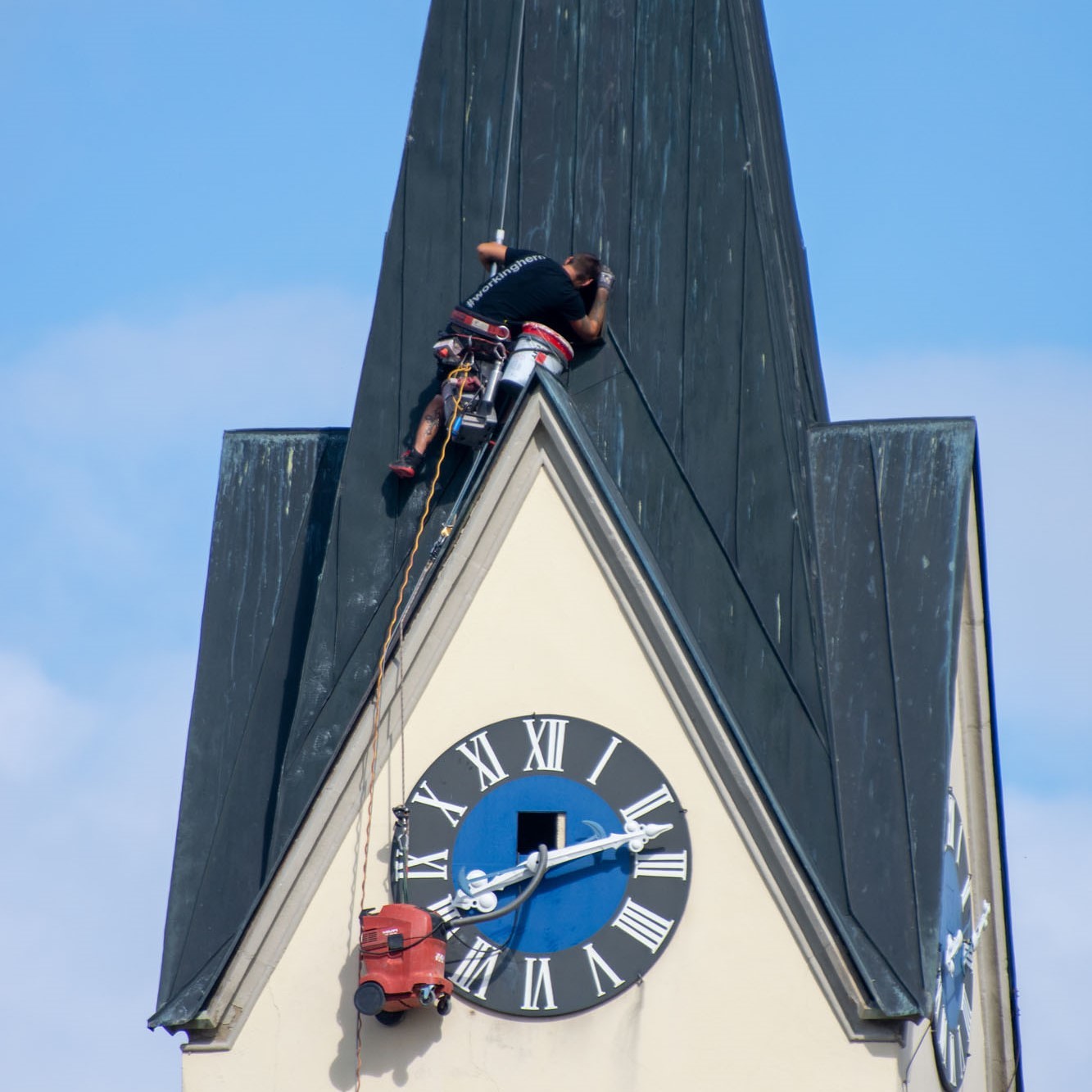 Schon von Weitem waren in diesen Tagen (KW 34) die sehr erstaunlichen und artistisch anmutenden Arbeiten am Kirchturm unserer Pfarrkirche zu sehen, die von der Firma Mayerl GmbH aus Dölsach in Osttirol durchgeführt wurden.