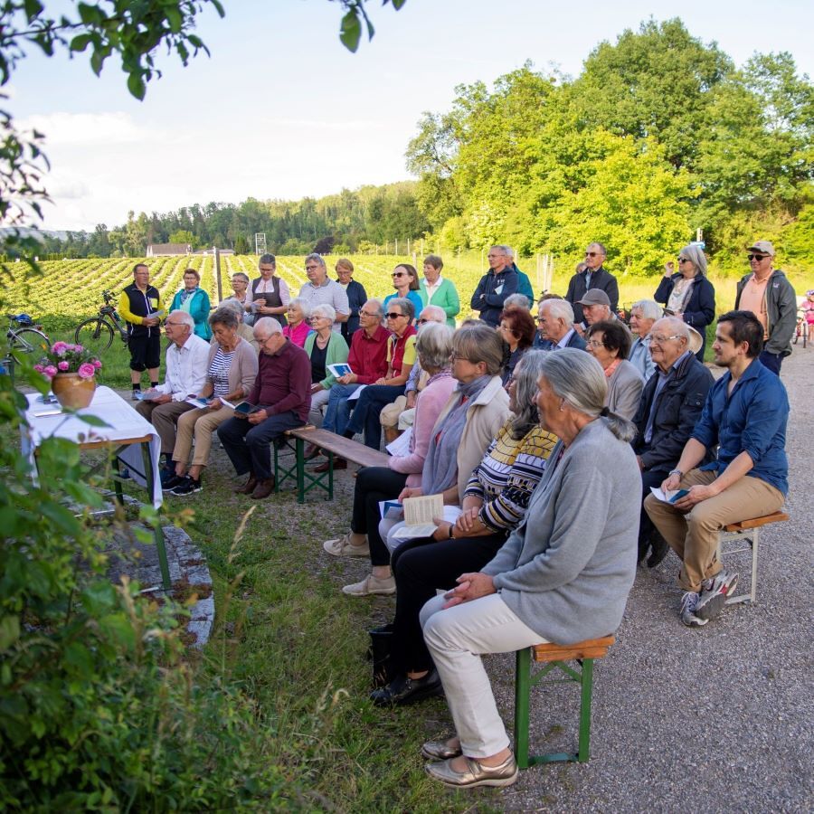 Über 30 Personen versammelten sich am Sonntag, 26. Mai 2024 auf Einladung der Katholischen Frauenbewegung und der Katholischen Männerbewegung beim Jubiläumskreuz in Fall, um einen Wortgottesdienst zu Ehren Marias zu feiern.