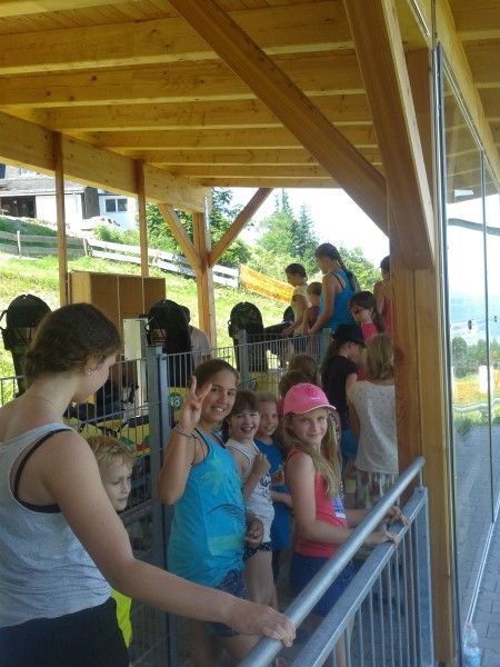 Nach dem für so manchen anstrengenden Aufstieg auf den Grünberg stärkten wir uns bei einer Jause und danach testeten wir die neue Rodelbahn. Diese wurde sowohl von Begleitern als auch Kindern als „voi cool“ empfunden und so kam es, dass es so manche Überredungskünste beanspruchte, um das ein oder andere Kind nach 4 Fahrten wieder für das Wandern zu motivieren. Doch aufgrund der heißen Temperaturen setzten wir unseren Weg freudig fort, weil wir den Laudachsee als nächstes Ziel vor Augen hatten. Dort angekommen, entschieden sich nach einiger Zeit sogar die größten Bademuffel ins kühle Nass zu stürmen und es wurde ausgiebig geplantscht. Etwas erschöpft aber zufrieden und erfreut über diesen gemeinsamen Ausflug marschierten wir zum Franzl ins Holz, von wo wir mit dem Bus wieder die Heimreise antraten.