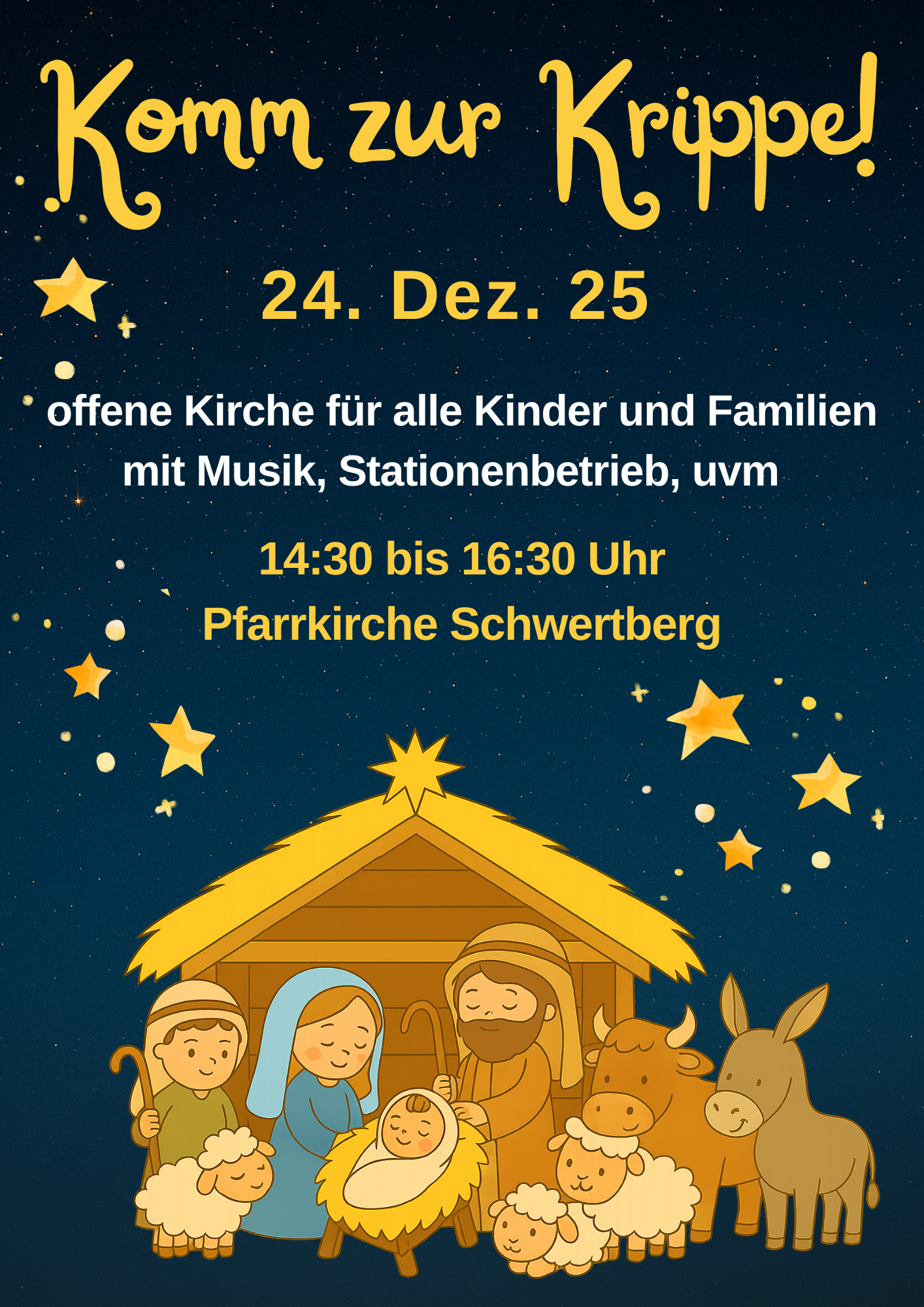 Auch heuer findet am 24. Dezember 2025 wieder die offene Kriche von 14:30 bis 16:30 für alle Kinder und Familien mit Musik, Stationenbetrieb uvm statt. Ihr seid eingeladen...