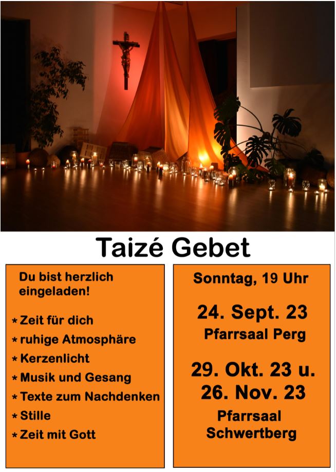 Ein Dekorationsteam bemüht sich, nach dem Vorbild der Kirche in Taizé, im Pfarrsaal Schwertberg einen inspirierenden Rahmen zu schaffen. Die Mitfeiernden sind eingeladen, bei Kerzenlicht zur Ruhe zu kommen und das tragende Gefühl des gemeinsamen Singens und Betens zu genießen.