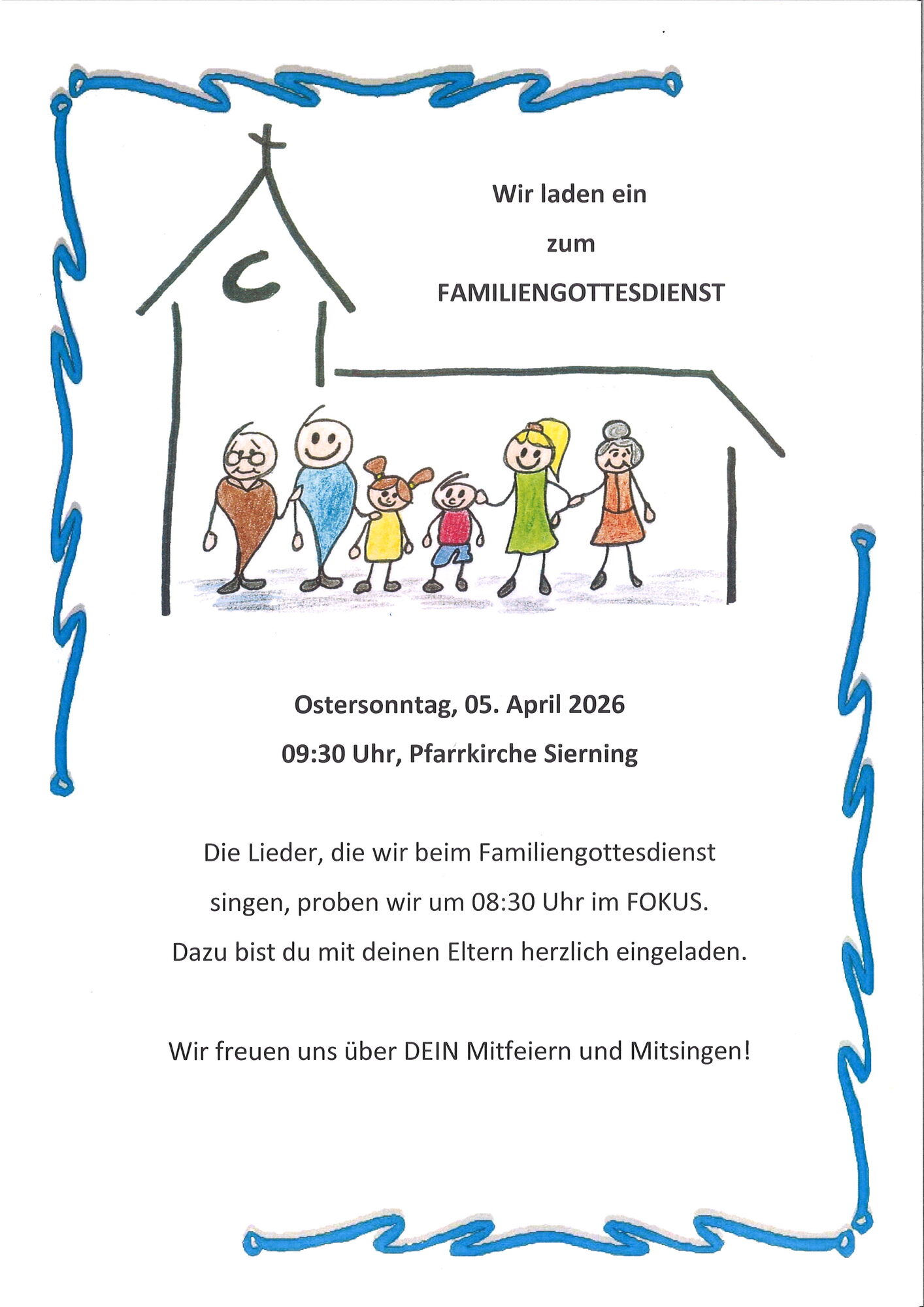 FAMILIENGOTTESDIENST Ostersonntag, 5.4.2026 Liederprobe ist um 8:30 Uhr im FOKUS - Wir freuen uns auf euer Kommen! Einladung