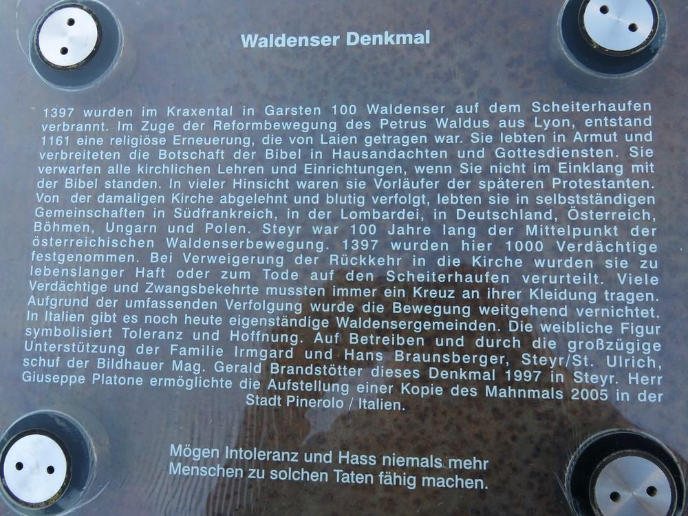 Bei unserem Rundgang erfuhren wir auch von den Waldensern und Täufern. Erstere können durch ihre Glaubenslehre in vielerlei Hinsicht auch als Vorläufer der Protestanten gesehen werden. Ein Denkmal erinnert an 100 Waldenser, die 1397 durch Verbrennen am Scheiterhaufen den Tod gefunden haben.