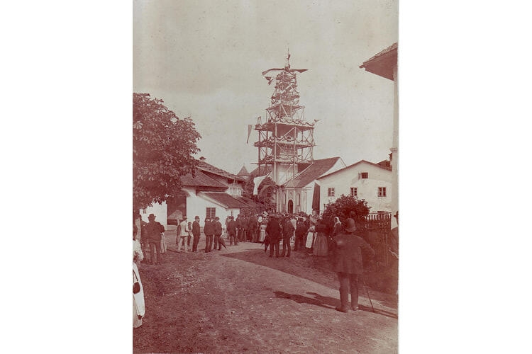 Die Kreuzsteckung am 25. Juni 1893 nach dem Neubau des Kirchenturmes.