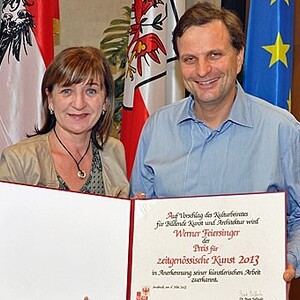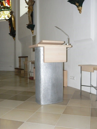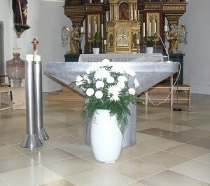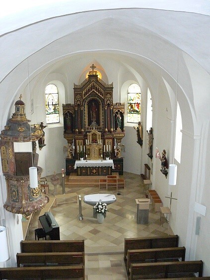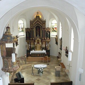 Der in dezentem Weiß gehaltene Innenraum der Kirche hat durch die Vergrößerung des Altarraumes spürbar an Weite gewonnen. Die von Künstler Werner Feiersinger gestalteten zentralen Elemente, Altar und Ambo, verstärken durch ihre metallische Optik und ihre klaren Formen den offenen und schlichten Charakter des Gotteshauses. Die aus Holz gestalteten Sitzgelegenheiten für MinistrantInnen, LektorInnen und der Vorsteherstuhl ergänzen das Gesamtbild. Die Mischung aus Metall und Holz spiegelt auch die tiefe Verwurzelung von Metall- und Holzverarbeitenden Betrieben des Ortes wider.