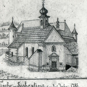 Von ihr sind im Schiff noch drei Joch erhalten. Die einst spitzbogigen Fenster wurden später mit Rundbögen versehen. Die alte Kapelle (6,5m x 11,5m) trug ein achteckiges Türmchen mit zwei Glocken. Im kleinen Raum standen zwei Altäre. Die einstige Ausdehnung ließ sich auf dem Kirchenboden ablesen, denn die Kapelle war steingemauert, die späteren Zubauten wurden aber aus Ziegeln ausgeführt. Wahrscheinlich war ein Schlosskaplan angestellt, da später von einem „Capellanhaus“ die Rede war.