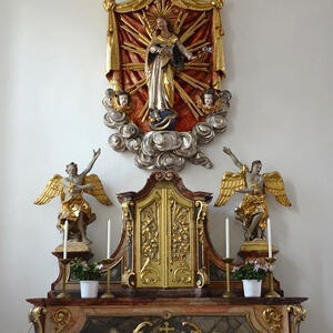 (Alter Marienaltar: Errichtet 1907 aus Spenden der Marianischen Jungfrauenkongregation, unter Pfarrer Asamer 1961 abgetragen)
