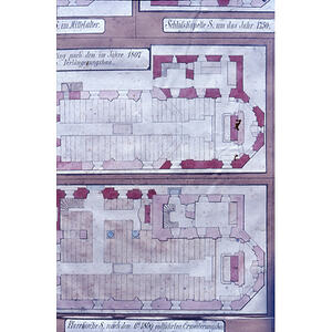 (1807/08 neuer Kuppelturm nach außen gestellt. Die Kirche nach Osten erweitert (neues Presbyterium). Der Choraufgang nach außen. Die Marienkapelle 1868/69 angebaut, dadurch kommt der Turm nach innen. Neues Nordportal und Ölberg)