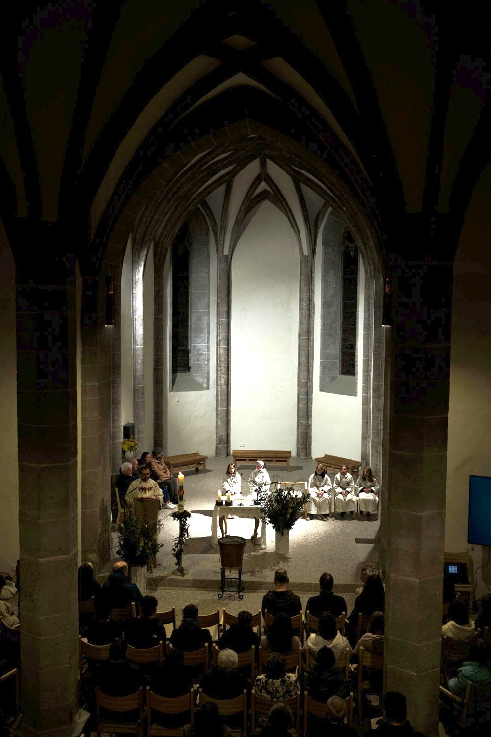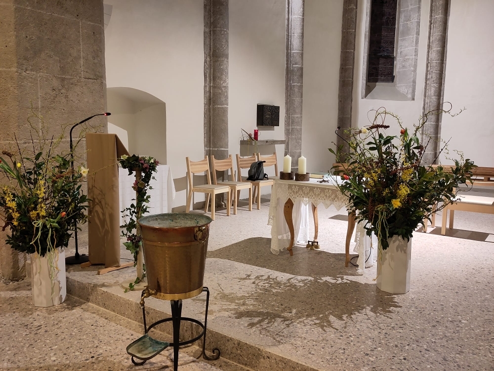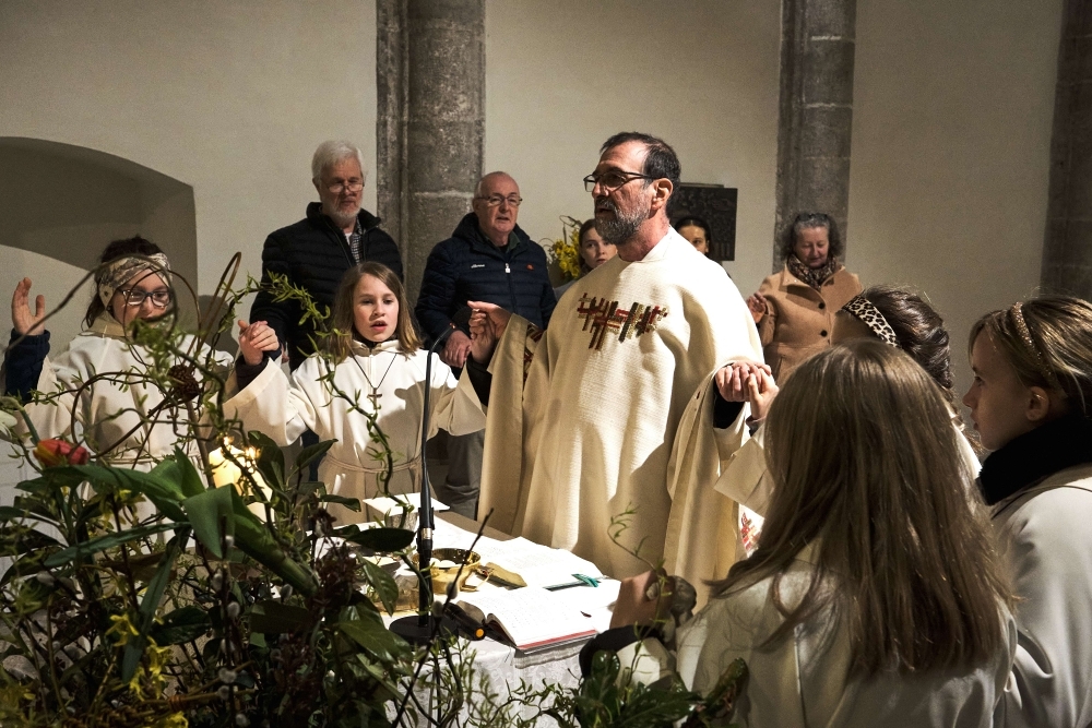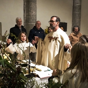 Der Gottesdienst begann traditionell am Osterfeuer vor dem Portal. In der noch dunklen, frisch renovierten Kirche verbreitete sich das Licht der Osterkerze von Bank zu Bank, bis der gesamte Kirchenraum in sanftem Kerzenschein leuchtete. Das „Lumen Christi“ erklang und wir feierten gemeinsam das erste Osterfest in unserer neuen Pfarrkirche.