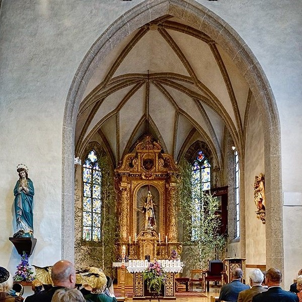 Unsere heutige Pfarrkirche ist ein spätgotischer Bau. Die wertvollen alten Glasgemälde in den Chorfenstern und der Opferstock sind um 1460 entstanden.