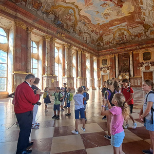 Es war 9:55 Uhr, als wir am Parkplatz ankamen und wir mussten noch ungefähr eine Stunde warten, bis die Führung losging. Wir vertrieben uns die Zeit mit Jausnen und Spielen. Dann durften wir endlich ins Stift hinein. Dieses wurde von drei Architekten – einem Italiener, einem Tiroler und einem Oberösterreicher – entworfen. Über allen Türen waren lateinische Schilder angebracht. Unsere Führerin ging mit uns als erstes in die wunderschöne, riesige Bibliothek. Die Fresken an der Decke lassen den Raum noch fünf Meter höher wirken. Die Bibliothek hat ca. 150.000 Bücher auf Lager und um diese zu lesen, muss man sich erst einen Termin mit dem Bibliothekar vereinbaren. Anschließend gingen wir durch mehrere Gänge und die Führerin zeigte uns Kirchenfenster und Mauern von der alten Kirche des Stiftes. Sie erzählte uns die Geschichte vom Hl. Florian: