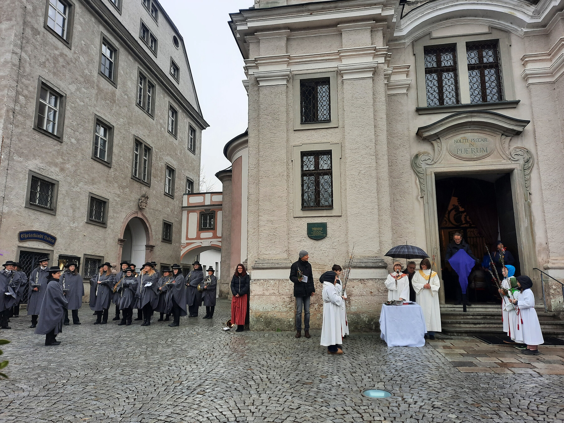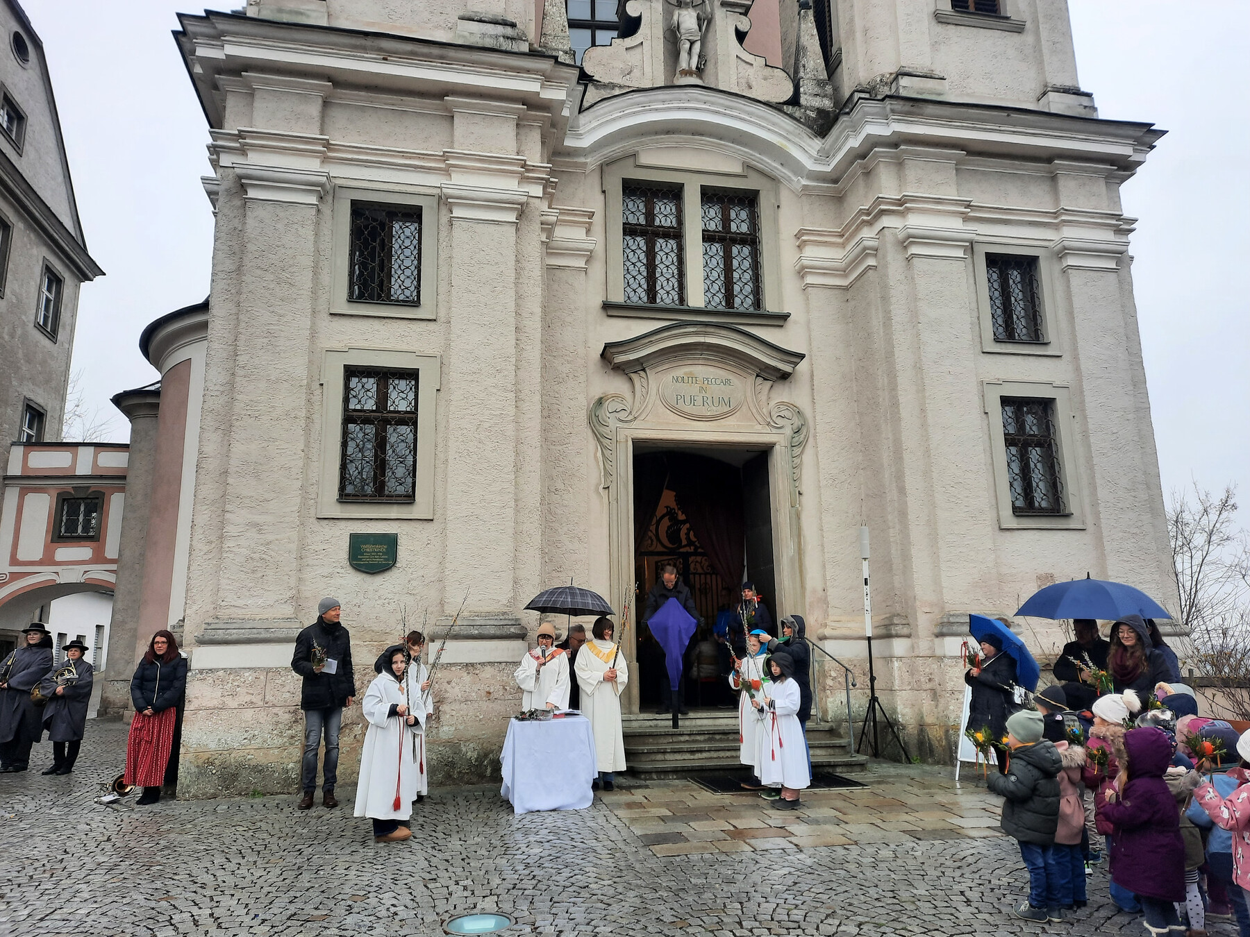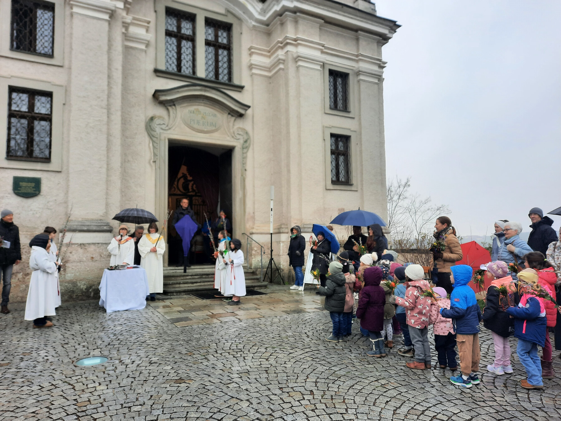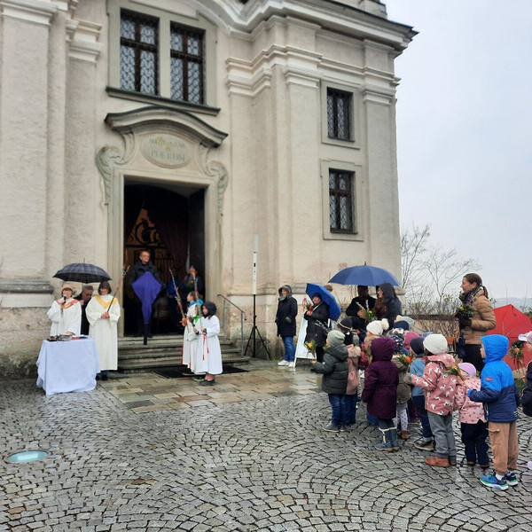 Auch viele Kindergarten- und Schulkinder nahmen an den Feierlichkeiten teil. Die Weihe der Palmbuschen fand am Kirchenplatz bei leichten Regen statt. Anschließend feierten Sissy Kamptner und Agnes Seidl den Gottesdienst mit der Pfarrgemeinde.