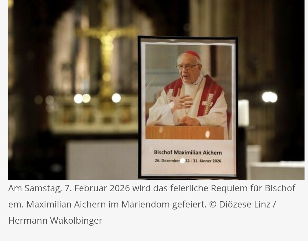 Begräbnis von Altbischof Aichern Beim Requiem am 7.02.2026 um 12.00 Uhr nimmt die Diözese Linz Abschied von Altbischof Maximilian Aichern. Tausende Mitfeiernde werden erwartet. Für alle, die im Dom nicht mitfeiern können, wird das Requiem ab 12.00 Uhr im ORF III live übertragen.