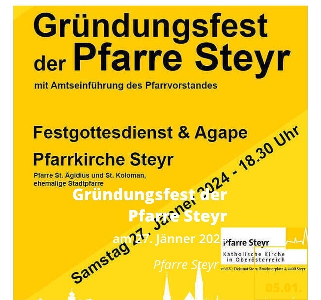Alle sind herzlich eingeladen zum Pfarrgründungsfest am 27. Jänner um 18.30 Uhr. In der Pfarrkirche Steyr (Stadtpfarrkirche) wird es eine Festmesse mit Bischof Manfred geben.