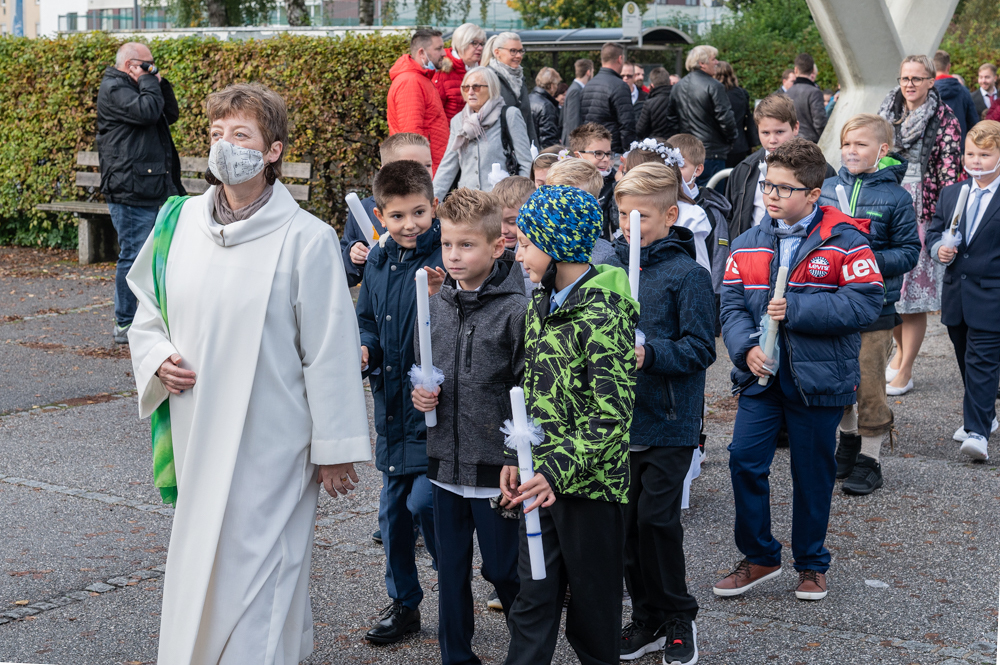 Die Vorgaben durch die Corona-Maßnahmen konnten durch die sehr gute Organisation eingehalten werden und so konnten die Kinder, ihre Familien, aber auch Teilnehmer aus der Pfarre in unserer großen Kirche gut verteilt ihre zugewiesenen Plätze einnehmen.