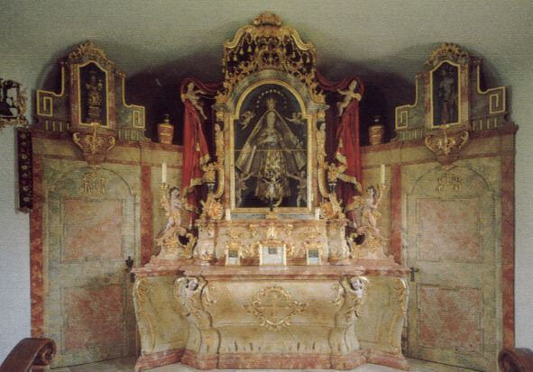 Der Rokokoaltar der Kapelle stammt aus der Bauzeit, weist aber bereits klassizistische Merkmale auf. Er ist als Baldachinaltar gestaltet, Putten raffen einen Vorhang zur Seite und geben dadurch den Blick auf ein von vier Putten flankiertes Madonnenbildwerk mit Lilie frei. Zu beiden Seiten des Gnadenbildes sieht man zwei Schreine mit Kopien von Gnadenbildern. Links das Prager Jesulein, rechts der Wiesheiland. Über der Mensa befinden sich zwei Engel mit Leuchtern.