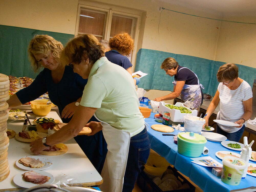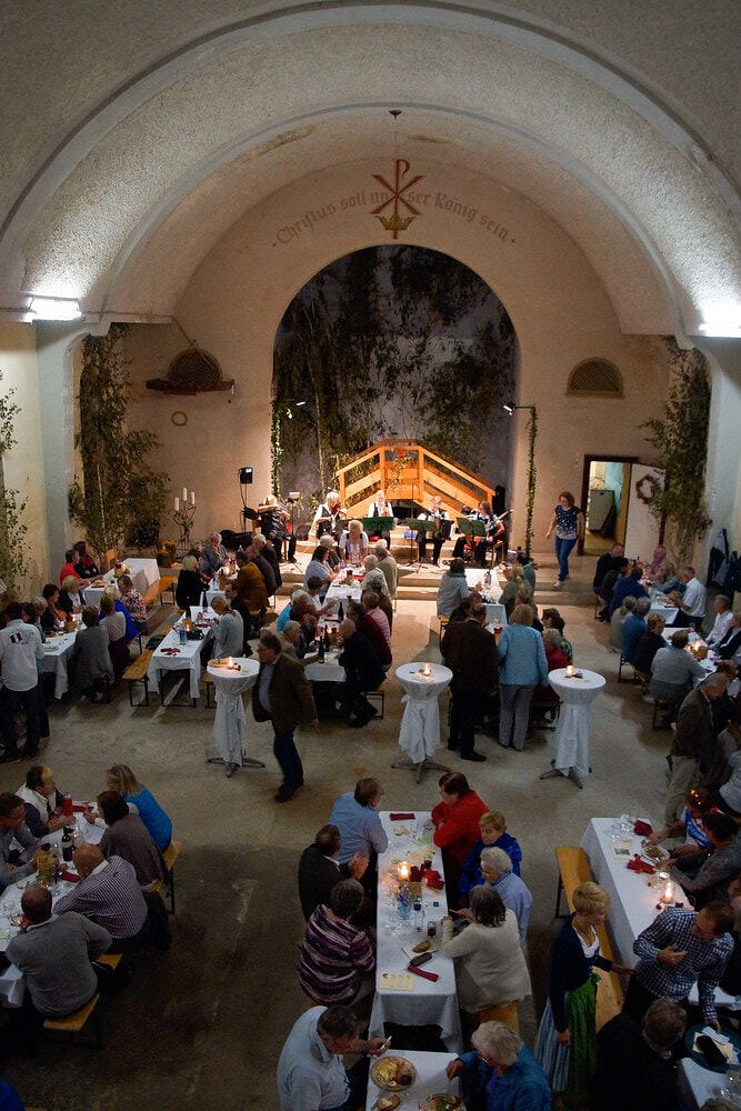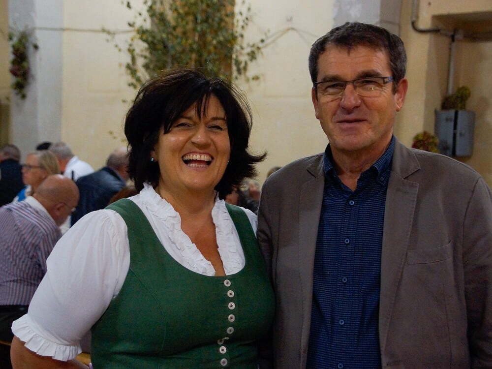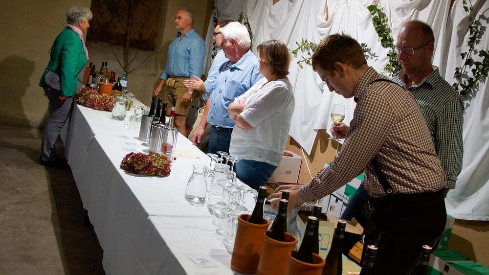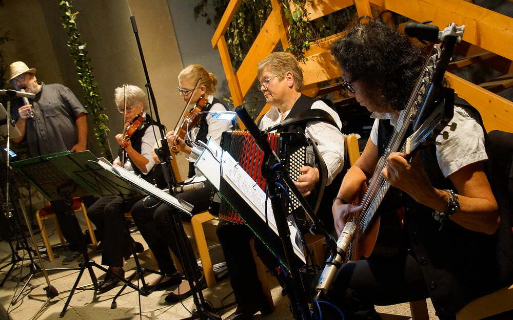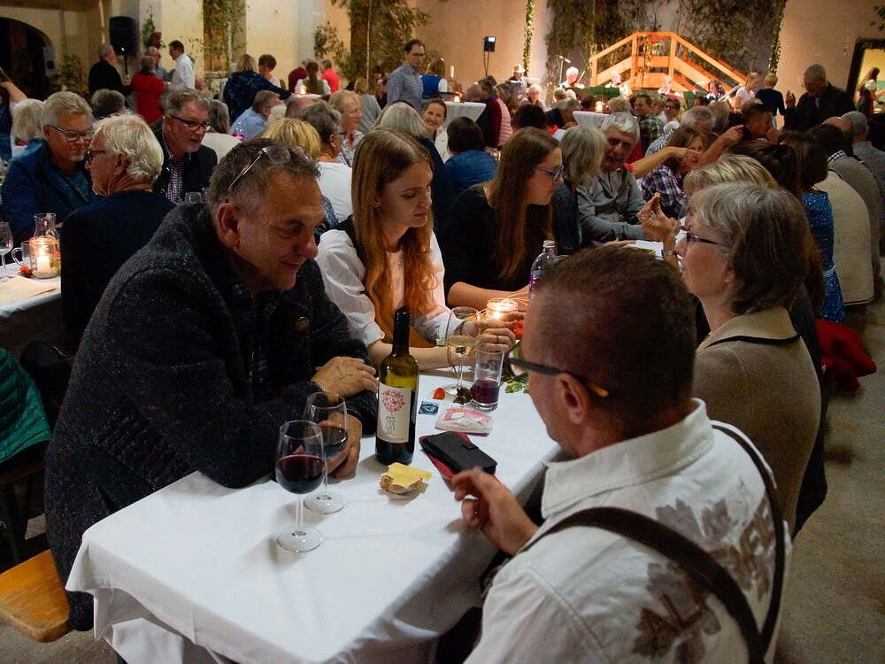 Diese war bis auf den letzten Platz gefüllt. Die Wegerer Schrammeln sorgten mit passender Musik für Heurigenstimmung. Die aufmerksame Bedienung versorgte die Gäste mit süßen (Pofesen, Mehlspeisenmix,..) und sauren (Sulz, Forellenfilet, Aufstriche, Brettljause,..) Köstlichkeiten und Getränken. Die erlesenen und ausgezeichneten Weine wurden kredenzt von Michael Brantner und Sebastian Rücker (Weingut Pennerstorfer, Kirchberg am Wagram), Wolfgang und Raphael Mosaner (Reiterweingut Frank, Ilmitz) und Karl und Michaela Pohlhammer (Weingut Lahrnsteig, Winzerdorf Arnsdorf Wachau). Herzlichen Dank der Familie Mosaner und ihren fleißigen HelferInnen für die vielen Arbeitsstunden!