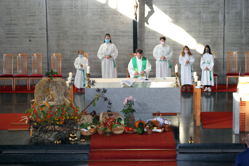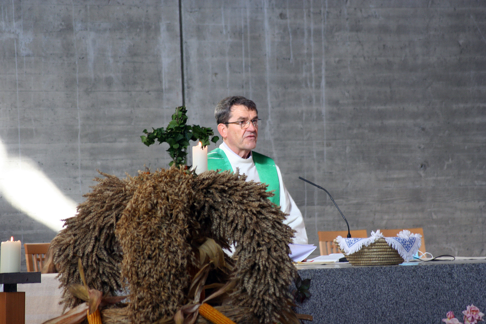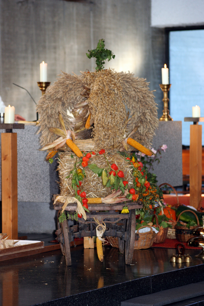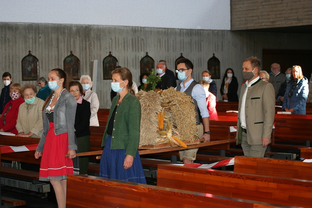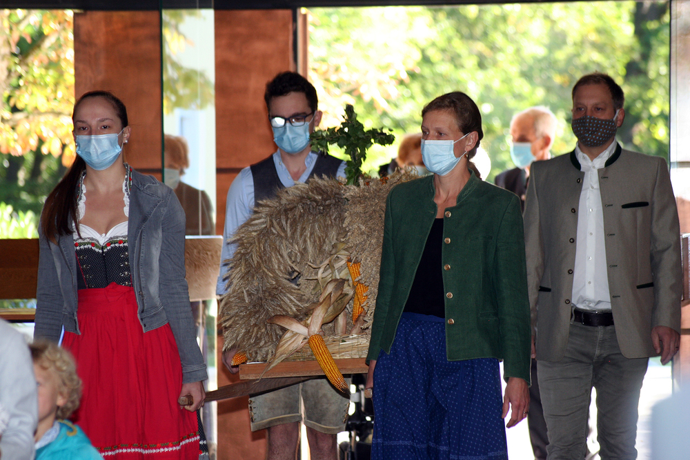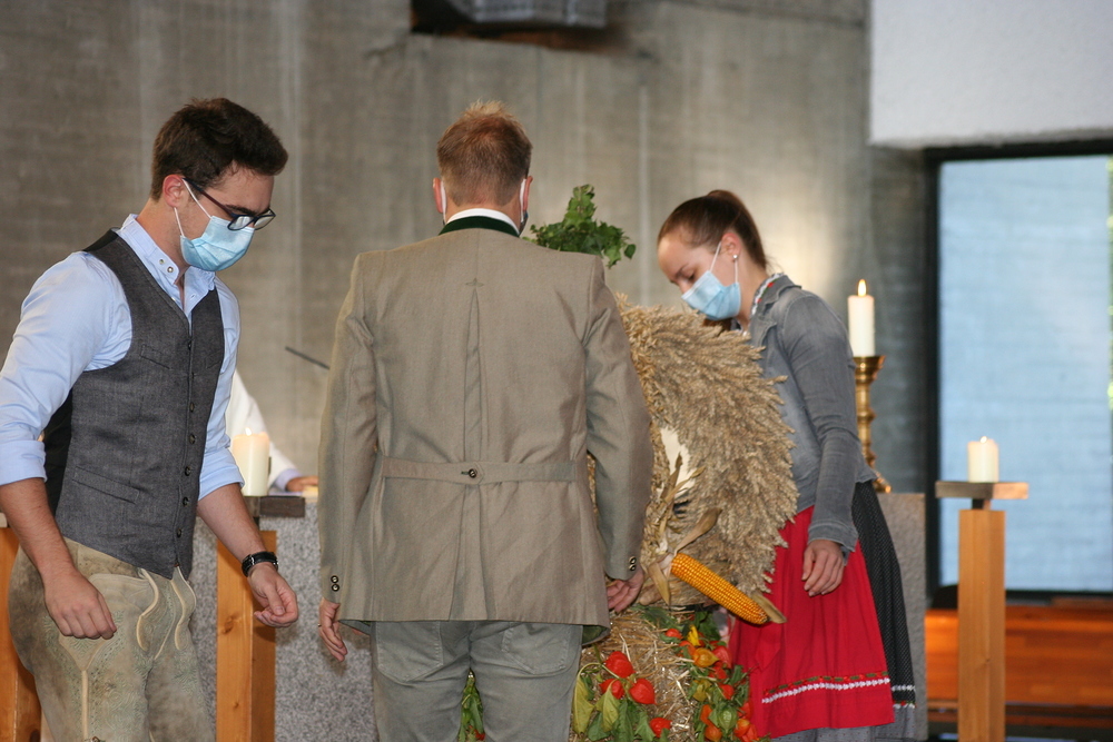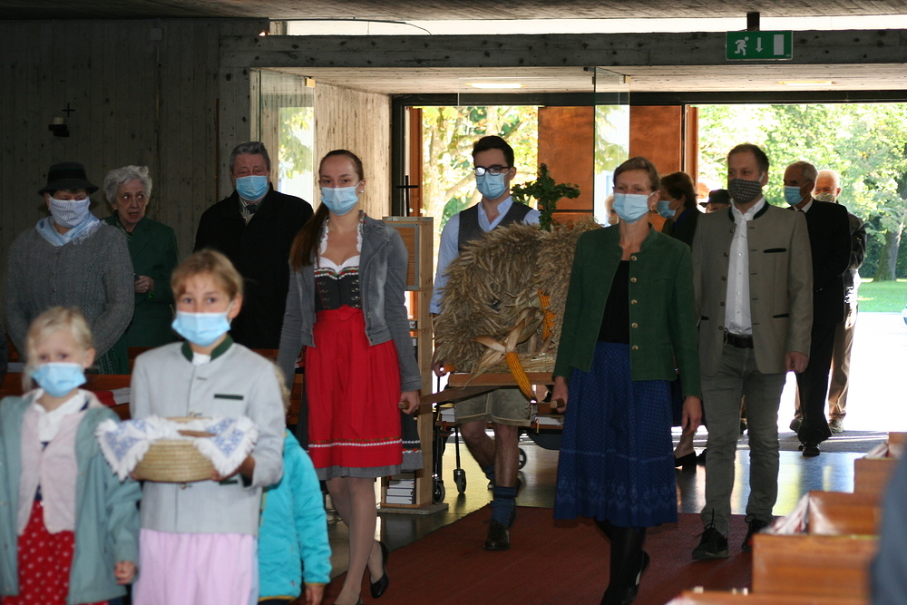 Die Erntekrone zog in die wunderbar geschmückte und bereits gut besuchte Kirche ein und wurde dort gesegnet. Besonderer Dank gilt allen, die das Getreide zur Verfügung gestellt und die Erntekrone gebunen haben, sowie der Musikkapelle Wachtberg, die die Messe musikalisch feierlich umrahmte.