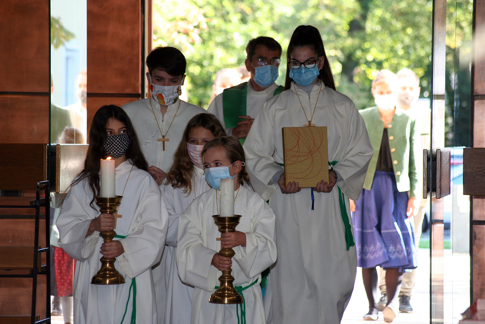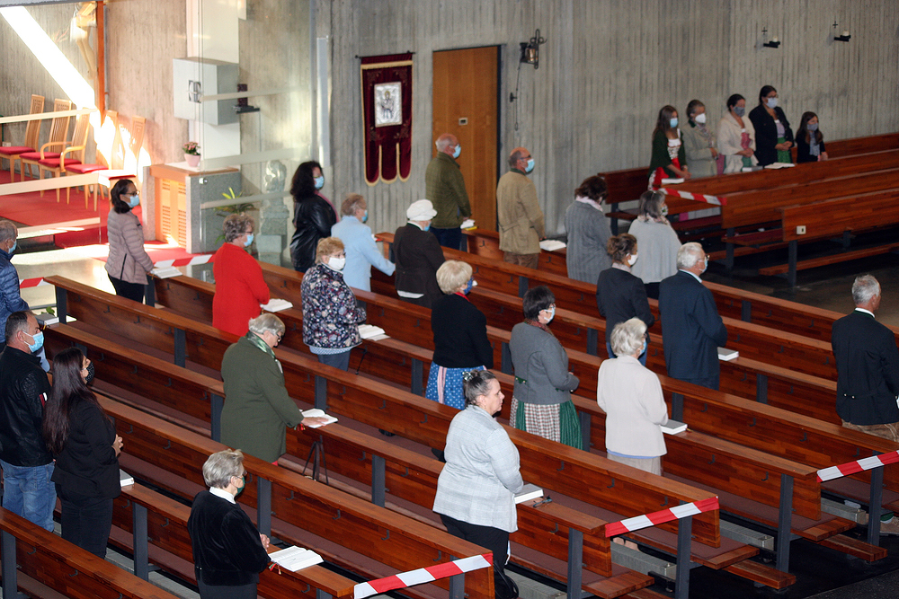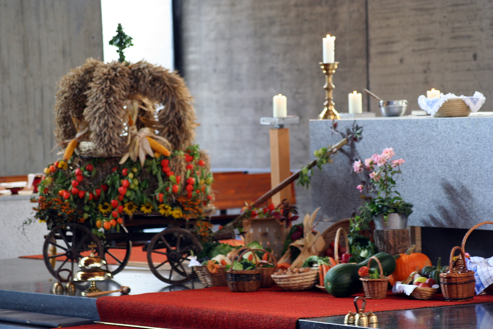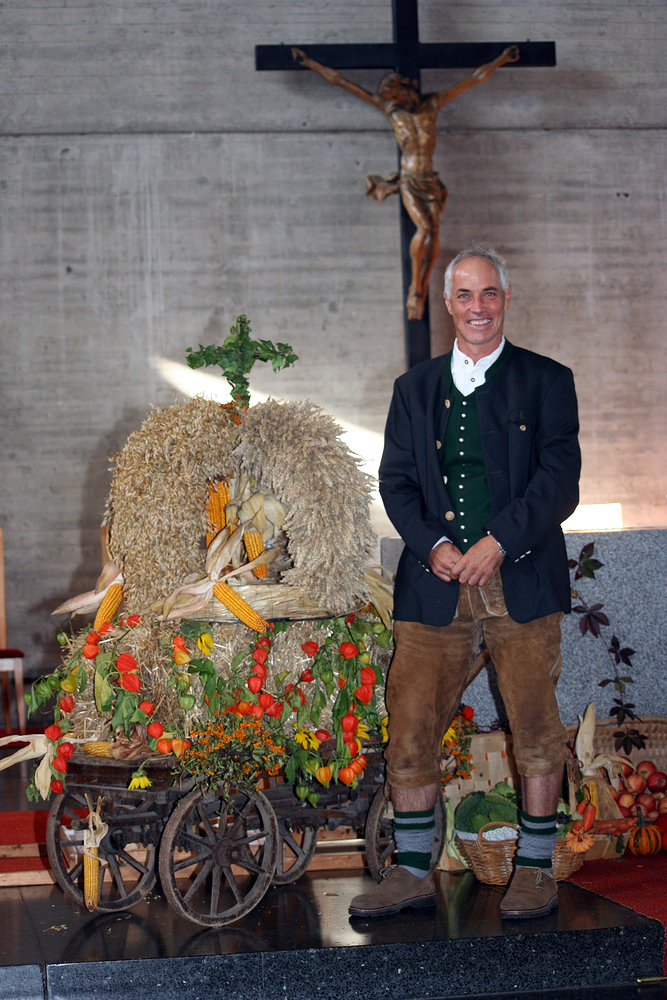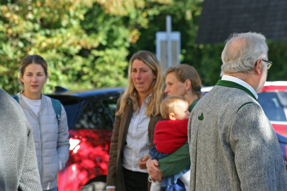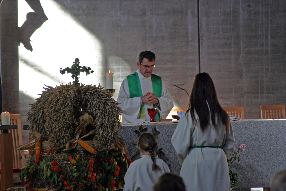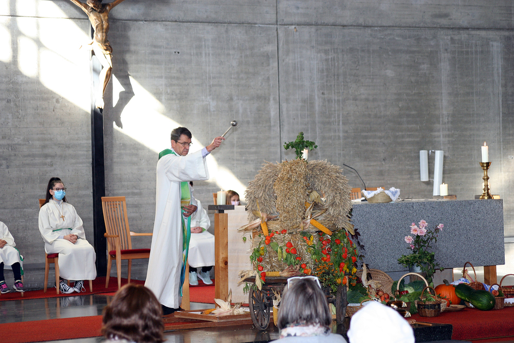 Die Erntekrone zog in die wunderbar geschmückte und bereits gut besuchte Kirche ein und wurde dort gesegnet. Besonderer Dank gilt allen, die das Getreide zur Verfügung gestellt und die Erntekrone gebunen haben, sowie der Musikkapelle Wachtberg, die die Messe musikalisch feierlich umrahmte.