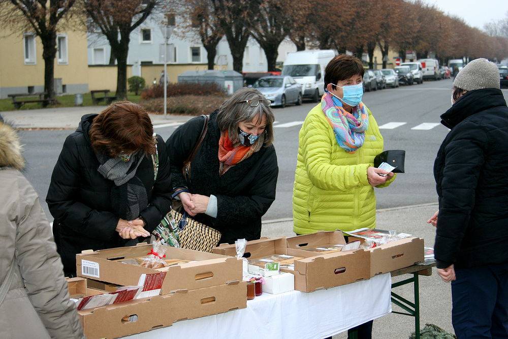 Heuer trotzten Maria Helmreich, Veronika Hagen und PGR-Obfrau Pauline Leitner, der Kälte, um Pfarr-Zündhölzer, selbstgebundenen Adventkränze, liebevoll handgemachte Weihnachtsbäckerei und hausgemachte Marmeladen zu verkaufen. Die zart-mürben Köstlichkeiten waren sehr begehrt und bei der Verteilung von KiZ-Gratisexemplaren haben sich – mit Abstand - wieder jede Menge nette Gespräche mit den BewohnerInnen von Münichholz ergeben.