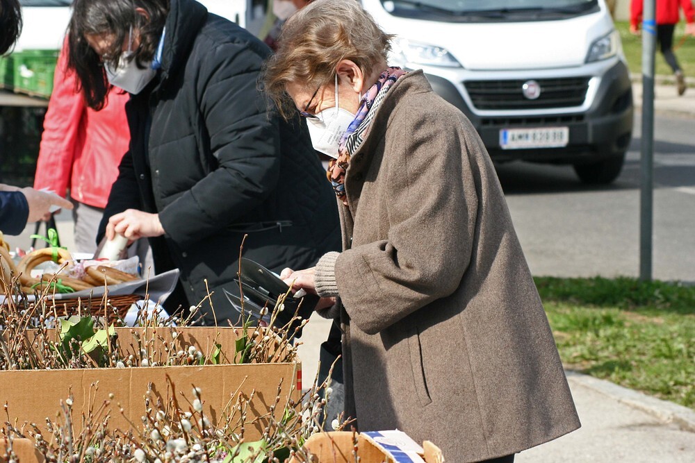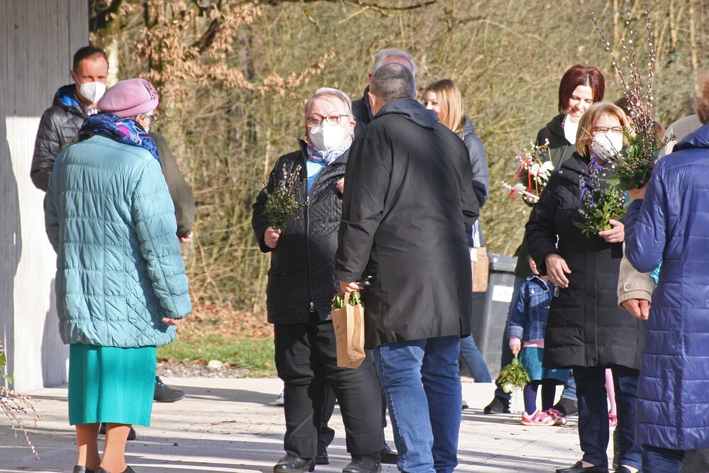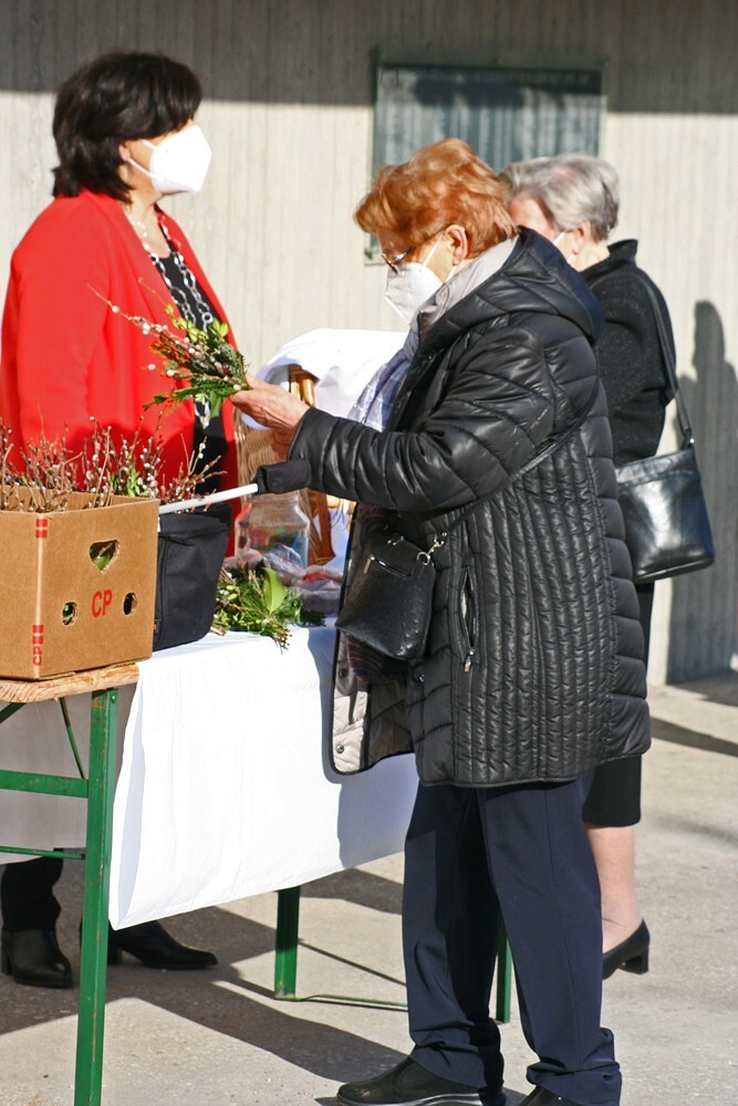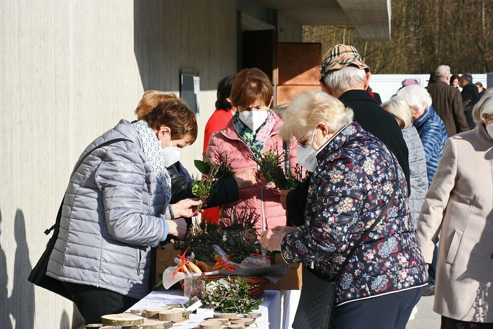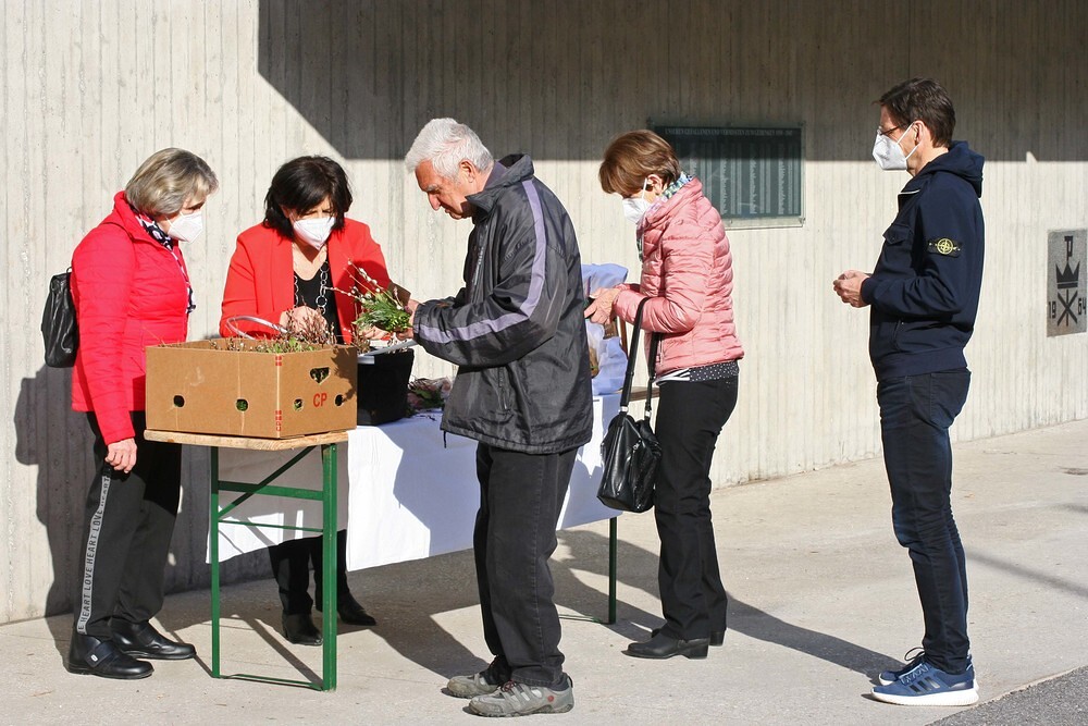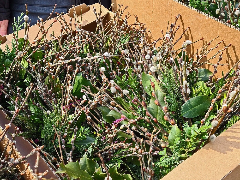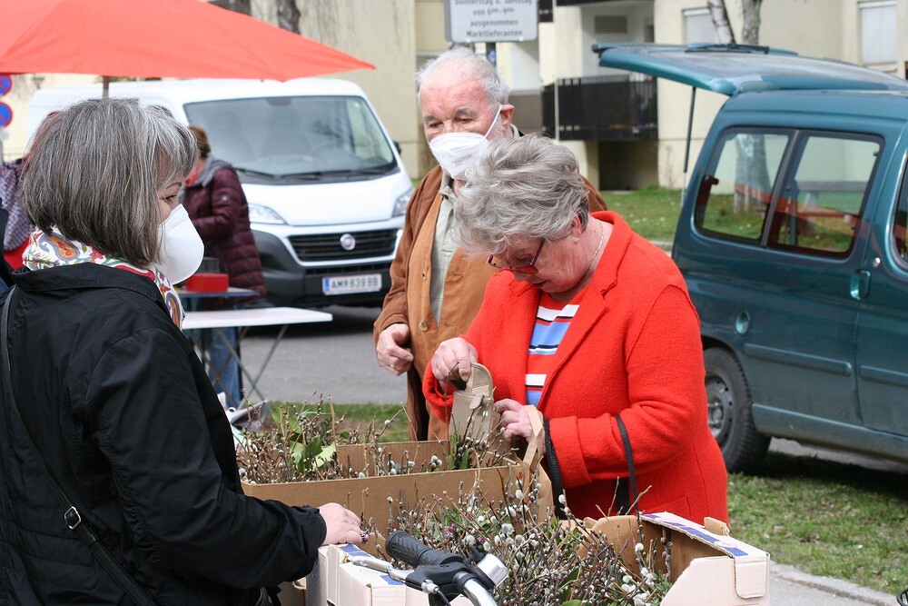 Die in Heimarbeit gebundenen Palmbuschen wurden gemeinsam mit Fastenbeugerl, Osterkerzen und Dekohasen gegen freiwillige Spenden von Elisabeth Mosaner, Veronika Hagen, Gusti Held und Doris Scheidleder bereits am Samstag am Wochenmarkt und am Sonntag am Kirchenplatz angeboten.