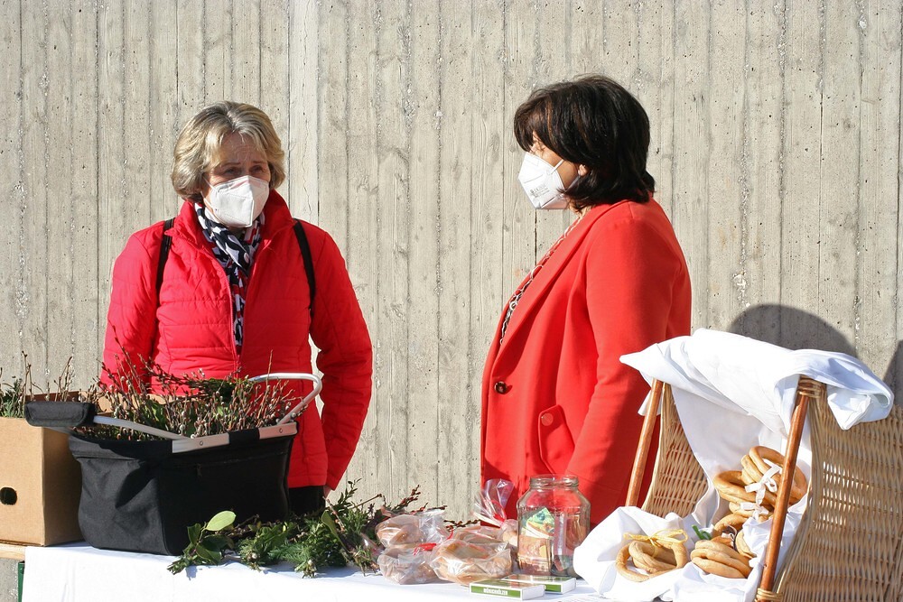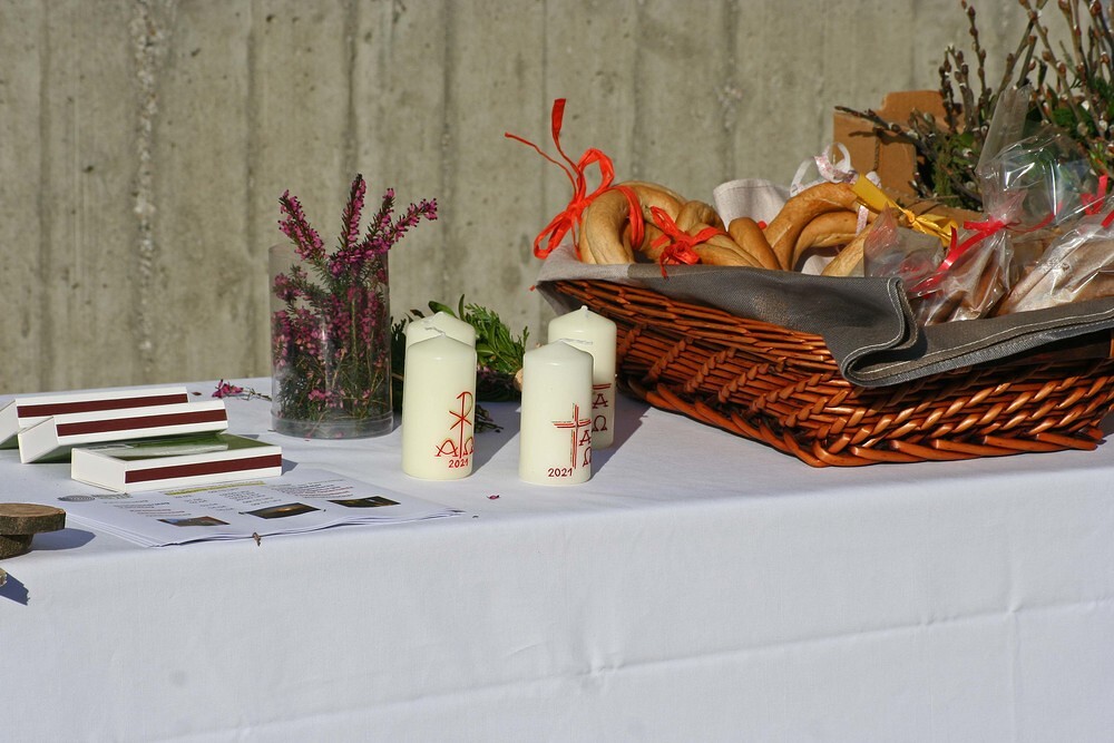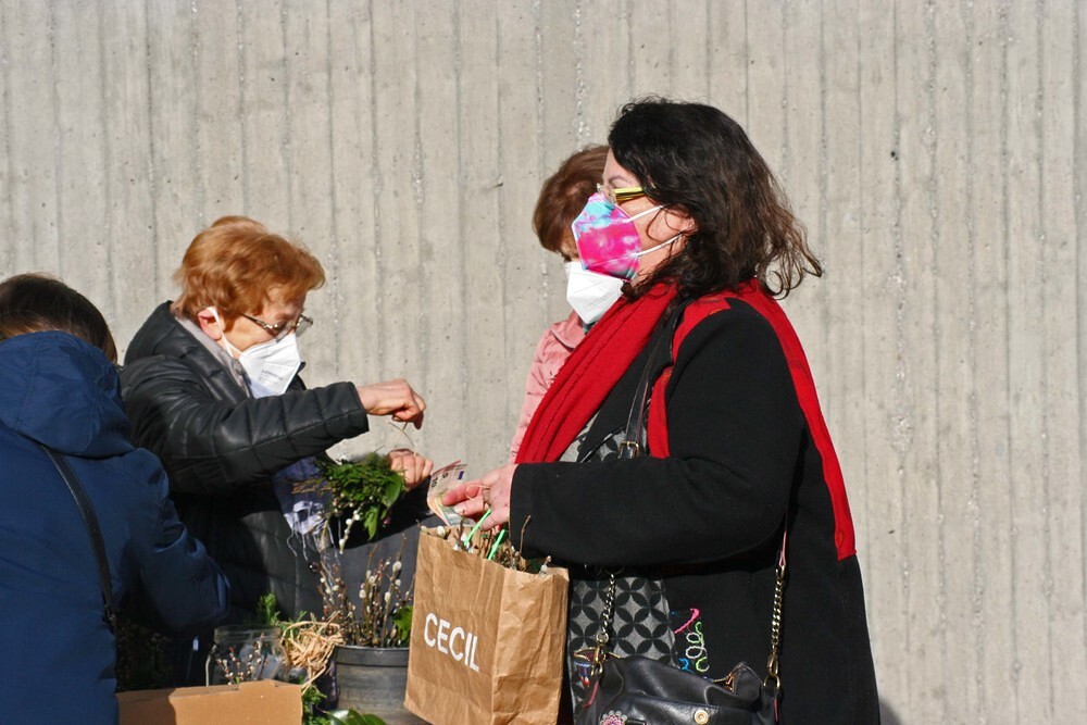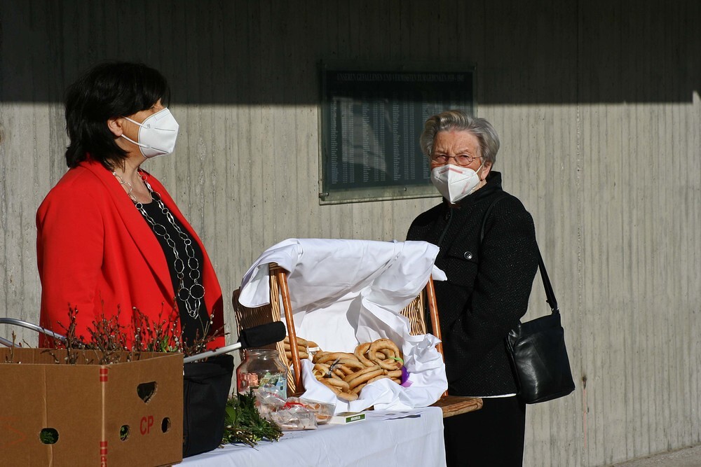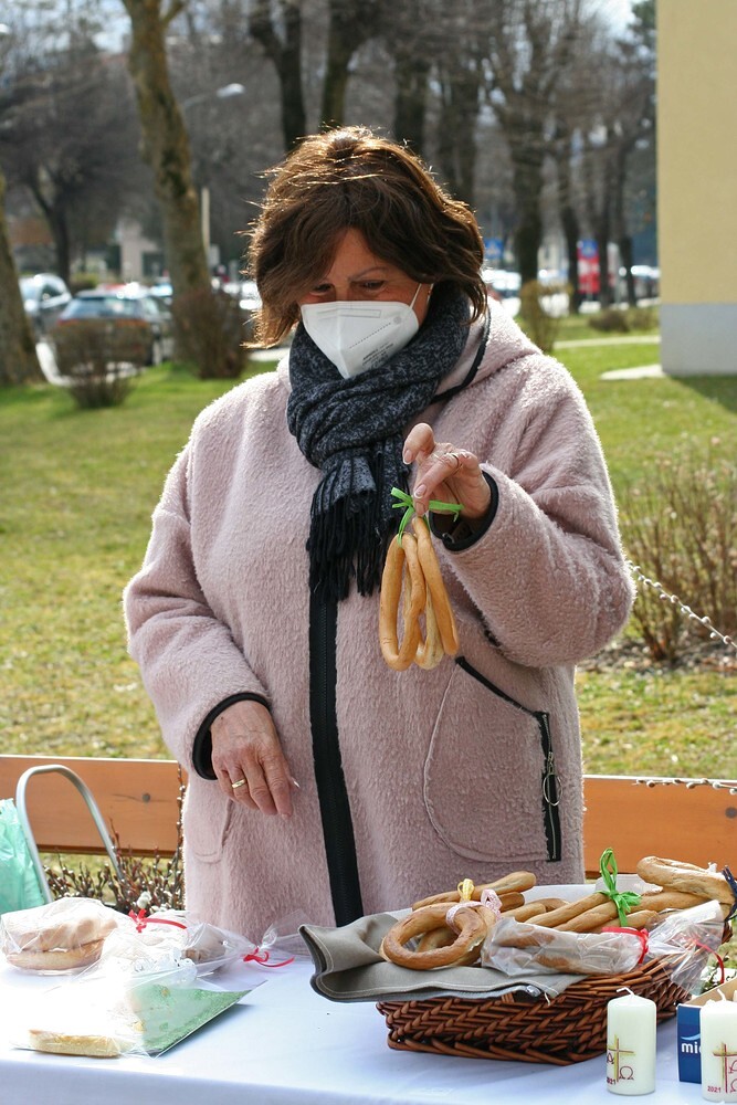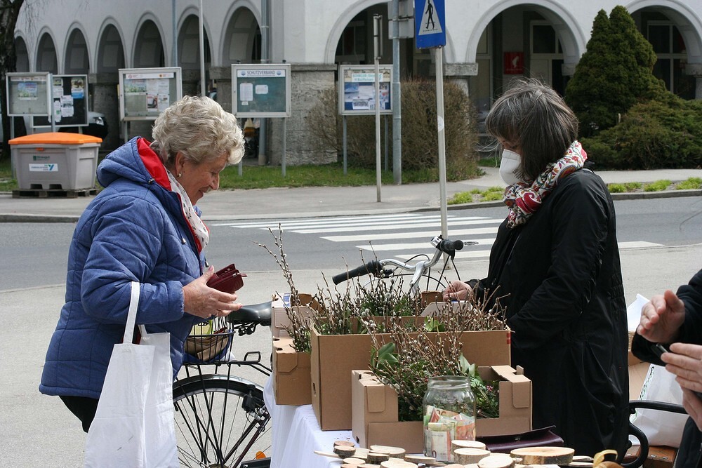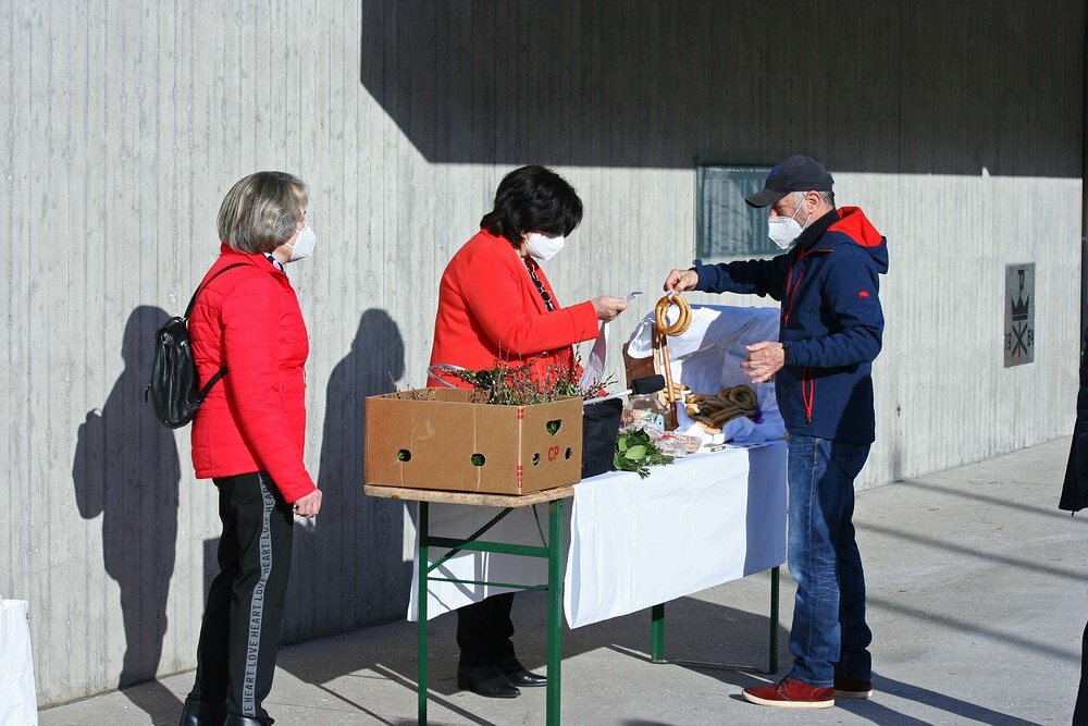 Die in Heimarbeit gebundenen Palmbuschen wurden gemeinsam mit Fastenbeugerl, Osterkerzen und Dekohasen gegen freiwillige Spenden von Elisabeth Mosaner, Veronika Hagen, Gusti Held und Doris Scheidleder bereits am Samstag am Wochenmarkt und am Sonntag am Kirchenplatz angeboten.