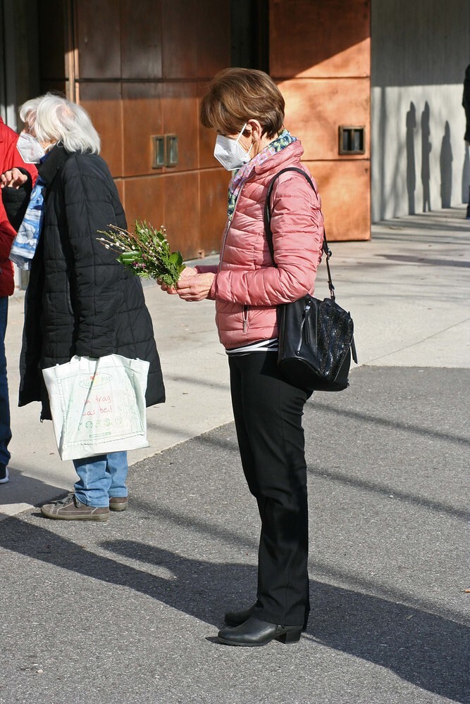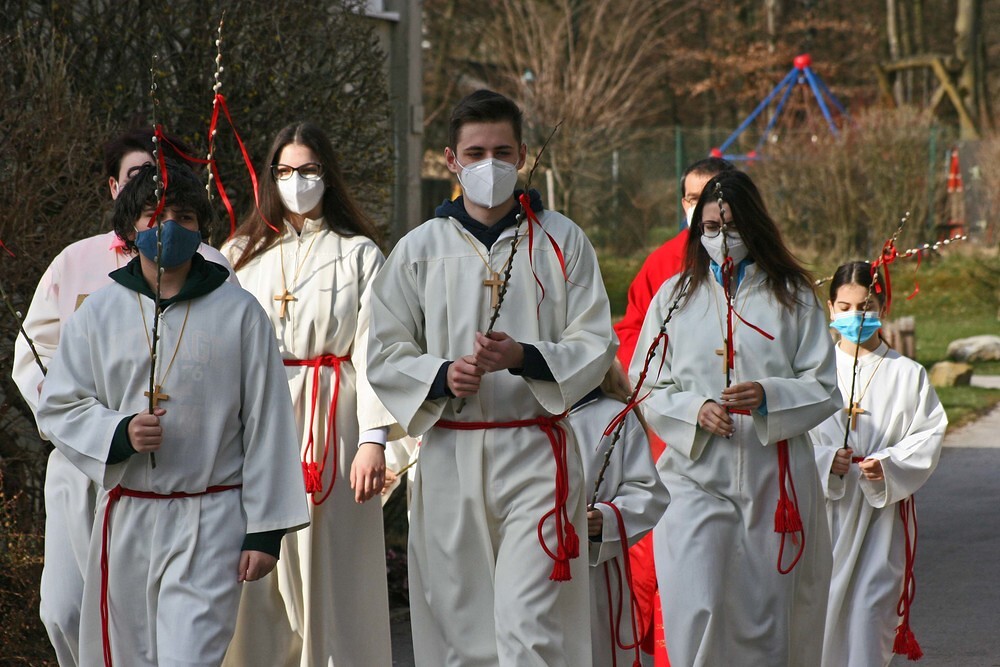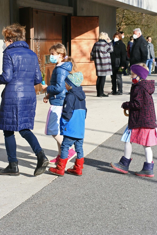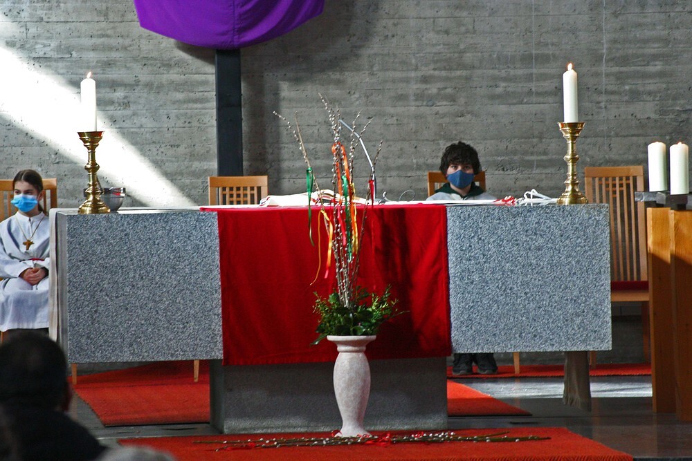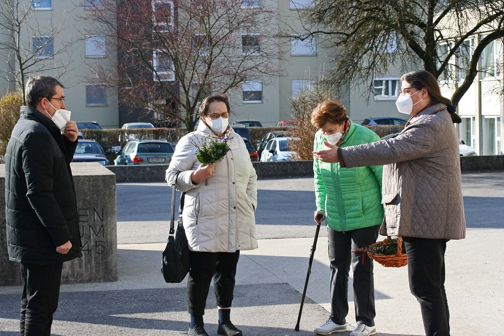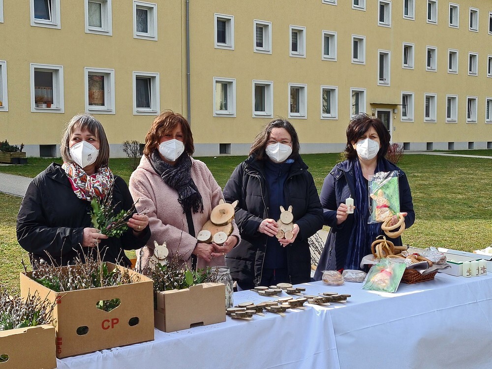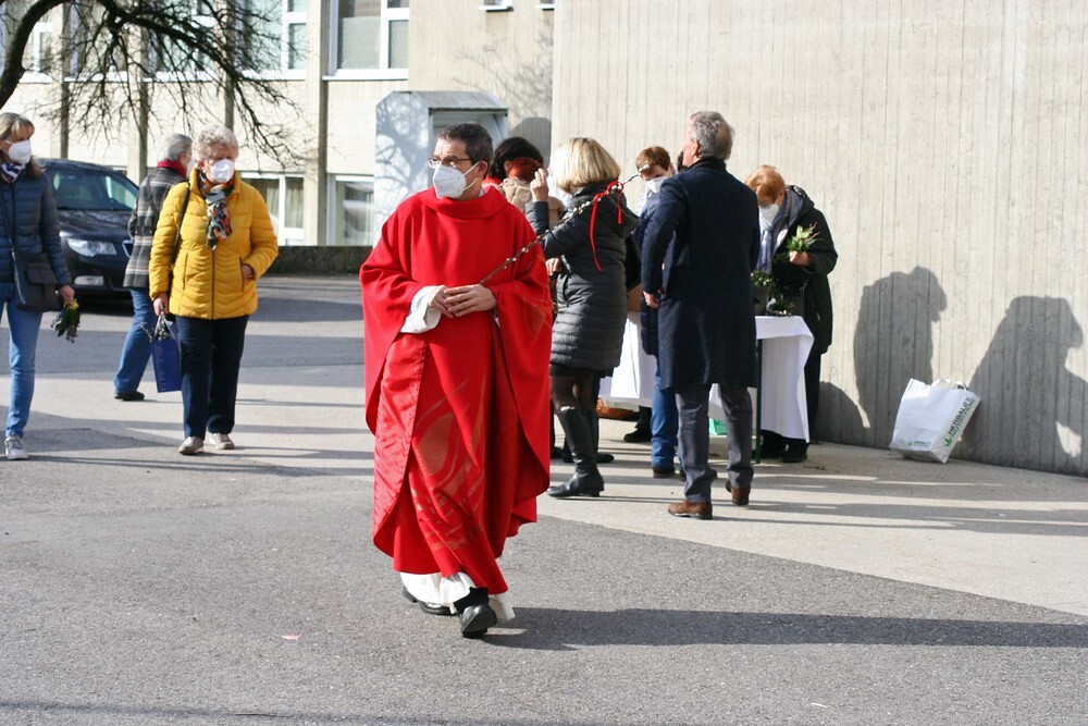 Die in Heimarbeit gebundenen Palmbuschen wurden gemeinsam mit Fastenbeugerl, Osterkerzen und Dekohasen gegen freiwillige Spenden von Elisabeth Mosaner, Veronika Hagen, Gusti Held und Doris Scheidleder bereits am Samstag am Wochenmarkt und am Sonntag am Kirchenplatz angeboten.