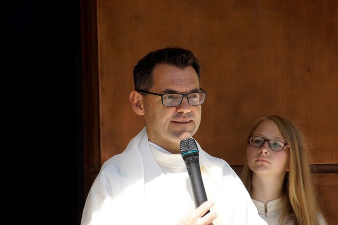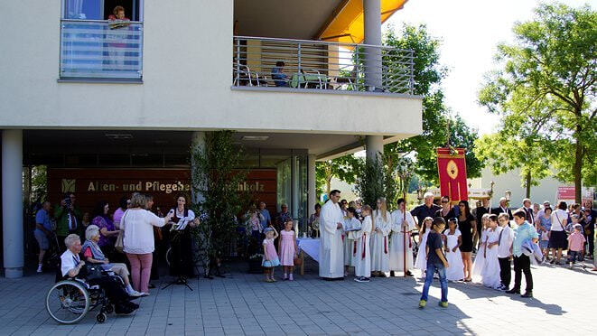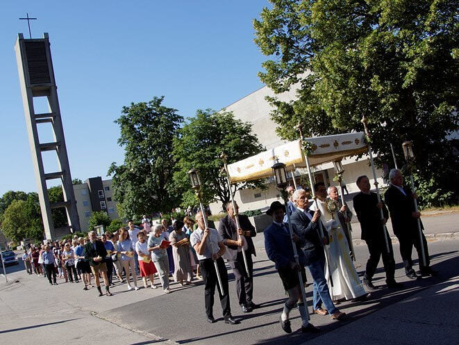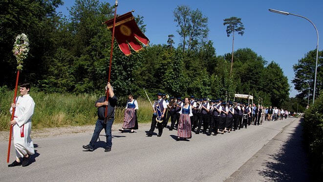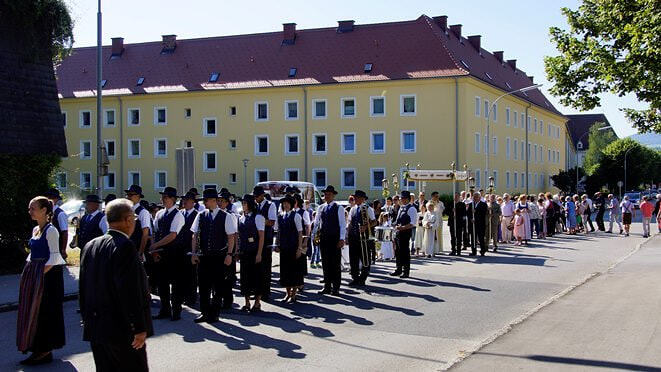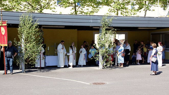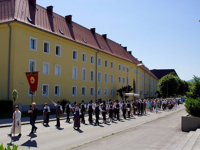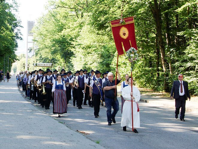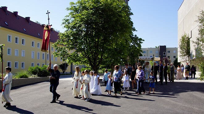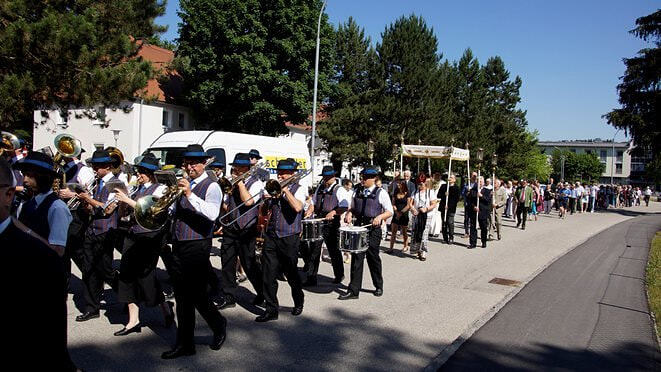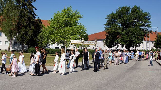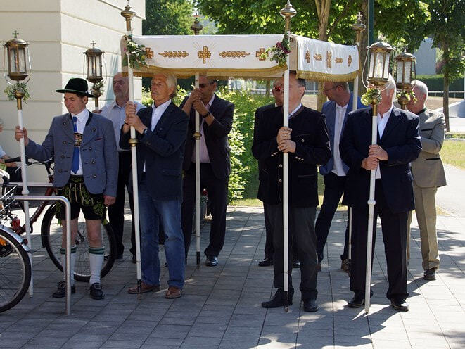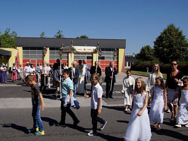 Bei strahlendem Sonnenschein wurde heuer in der Pfarre Fronleichnam zelebriert, wobei Mitglieder der KMB als Fahnen-, Himmel- und Laternenträger im Einsatz waren. Im Anschluss an die Prozession stärkten sich die Mitglieder der Musikkapelle, Erstkommunionkinder und alle Helfern bei einer Leberkäsjause im Pfarrzentrum.
