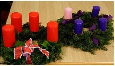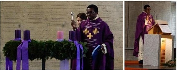 Im Pfarrgottesdienst, Sonntag, 3.12.2017, zum 1. Adventsonntag segnete Kooperator Kingsley Okafor den Adventkranz und sprach in seiner Predigt über dessen Symbolik: Der Kreis weist auf die mit der Auferstehung gegebene Ewigkeit des Lebens hin, das Grün auf die Farbe der Hoffnung und die Kerzen weisen auf das kommende Licht, das in der Weihnachtsnach die Welt erleuchtet. Drei Kerzen sind violett, entsprechend der liturgischen Farbe des Advents, eine Kerze für den dritten Adventsonntag ist rosa.