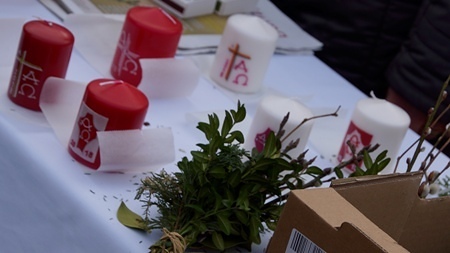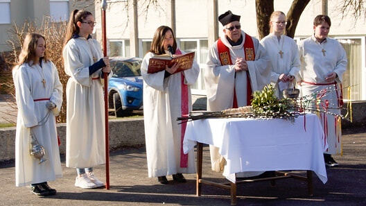 Am Wochenmarkt am Samstag, dem 24.3.2018 wurden nun diese Palmbuschen, sowie Backwaren (Osterkekserl, Osterhasen), Kerzen und Fastenbeugel zum Verkauf angeboten und die Linzer Kirchenzeitung verteilt. Mit dabei waren die Firmlinge Raphaela, Marcel und Laura, Sandra Heurix, Elisabeth Mosaner, Maria Catel , Maria Helmreich sowie Pauline Leitner mit ihren Enkelkindern Anna-Stefanie und Bastian. Die Weihe der Palmbuschen am Palmsonntag nahm KonsR Gerold Harrer vor, begleitet von Past. Assistentin Ursula Stöckl. Musikalisch umrahmt wurden die Prozession und der Gottesdienst von der MK Wachtberg und von Kindern des Pfarrkindergartens, geleitet von Ursula Hölzl und Tanja Kickinger.