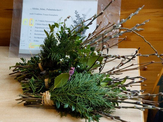 Nach Tradition der Traun-Ennsplatte werden zu einem Palmbuschen 7 Pflanzen: 5-7 Stück Palmzweige, 3 Stk. Haseltriebe, Segenbaum (Thuja), Zedernbaum (Wacholder), Buchsbaum, Stechpalme und Erika zusammengebunden. Rund 275 (!) Palmbuschen wurden von Pauline Leitner, Maria Helmreich, Liselotte Täuber, Theresia Hofstätter, Maria Catel, Auguste Held, Doris Scheidleder, Christa Dierer, Elisabeth Ahrer, Elisabeth Stockreiter und Josef Riedl gebunden.