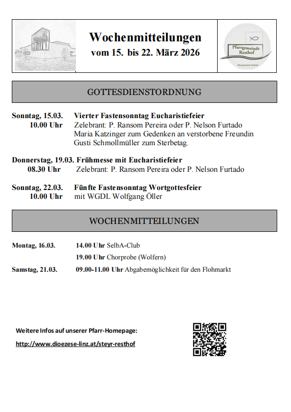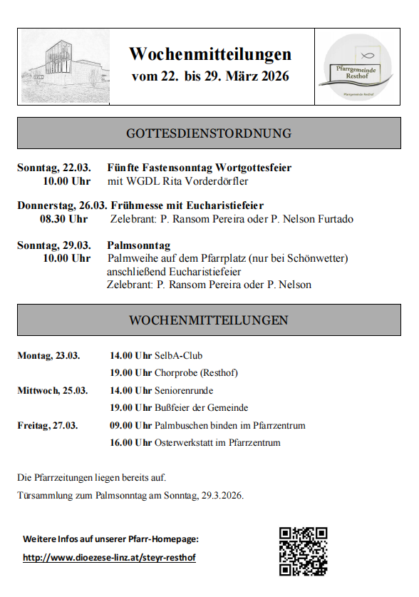 Hier finden Sie einen Überblick der Gottesdienste, Veranstaltungen und Termine in der kommenden Woche sowie wichtige Informationen