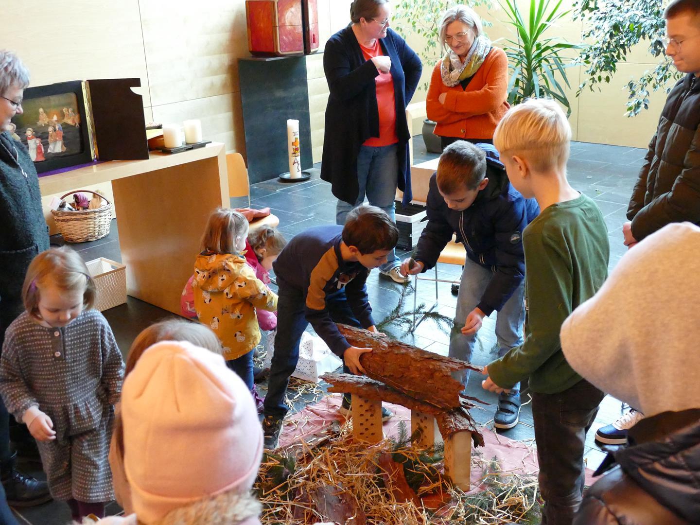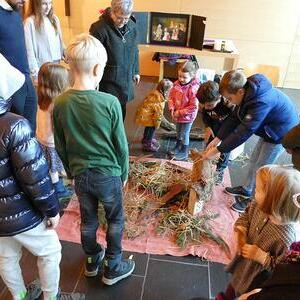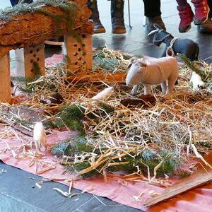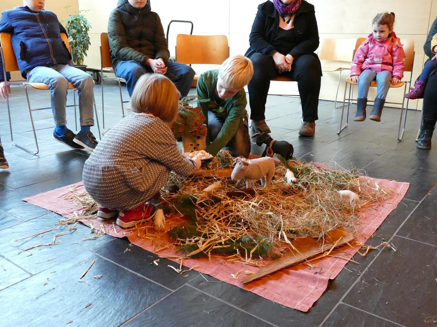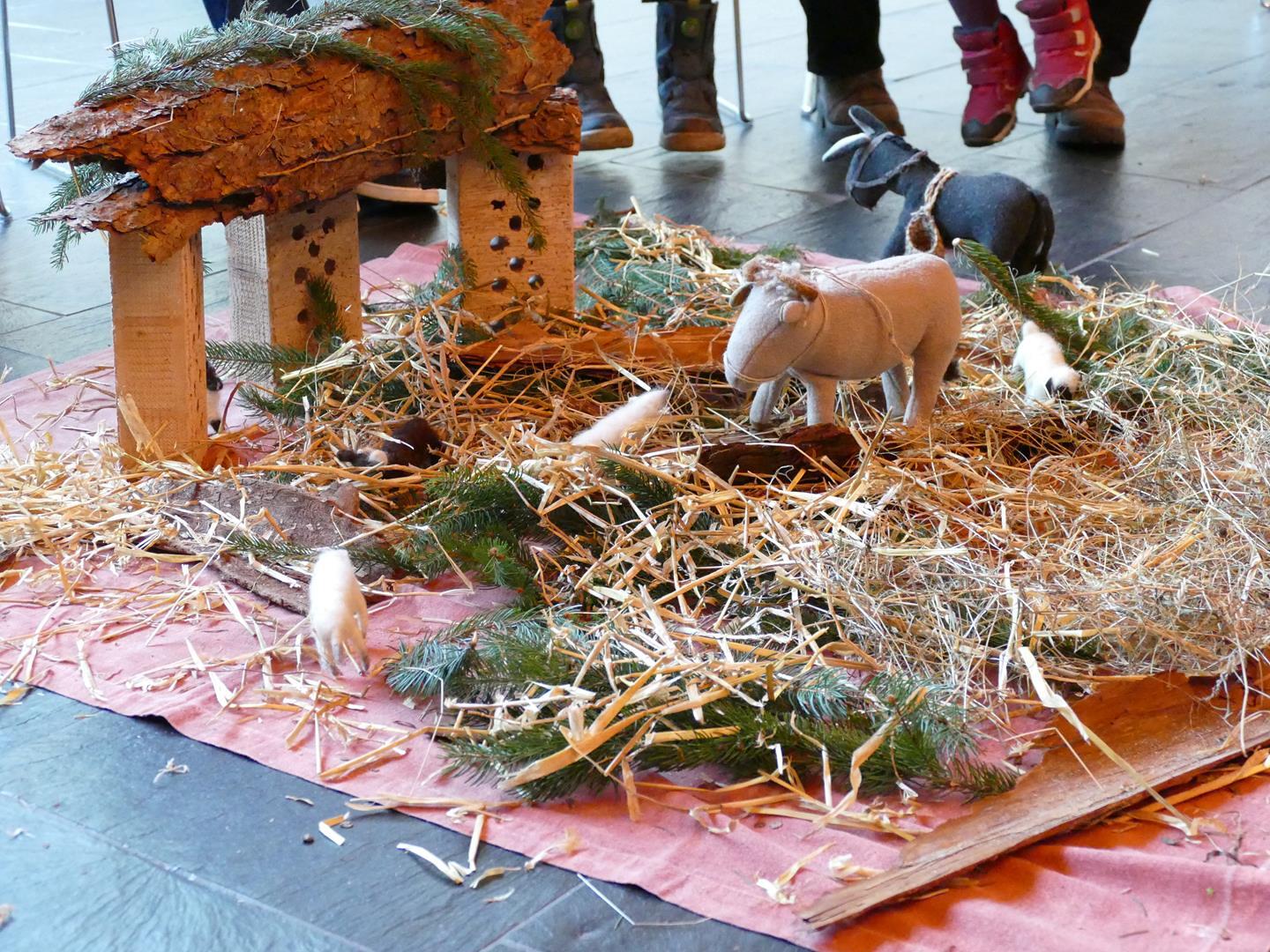 Auch die Kinder setzten dieses Thema bei uns in der Kapelle um und so wurde aus verschiedensten Materialien eine Krippe gebaut. Hier kamen Tannenzweige, Stroh, Ziegelsteine und Tierfiguren aus Stoff zum Einsatz. Das Ergebnis konnte sich auf jeden Fall sehen lassen.