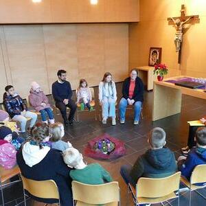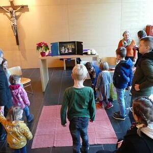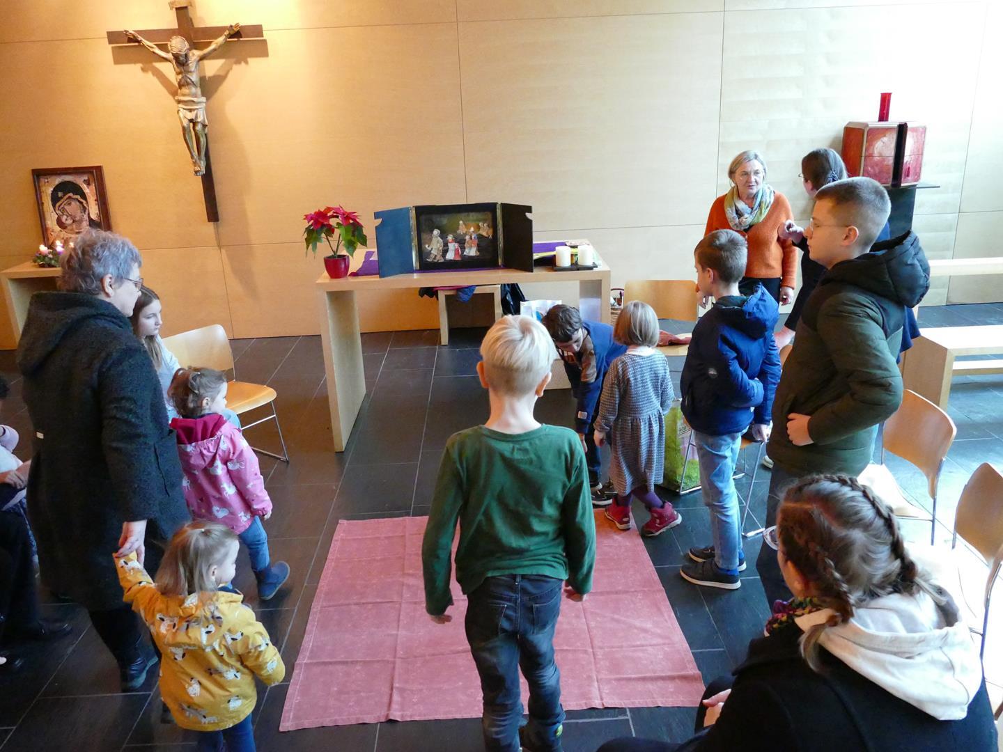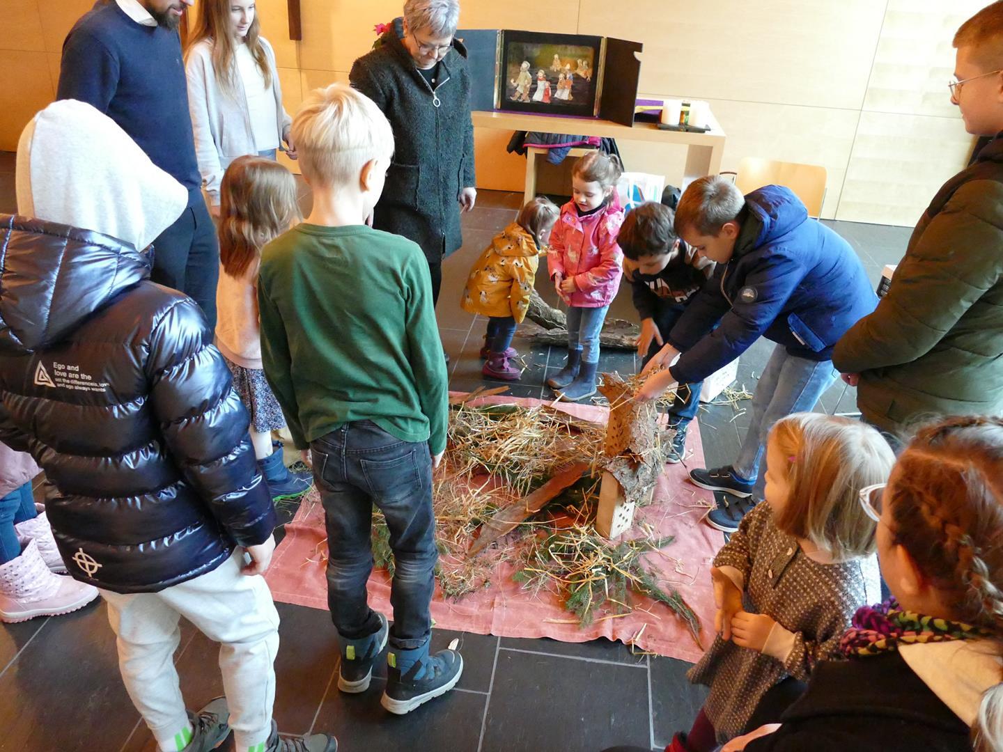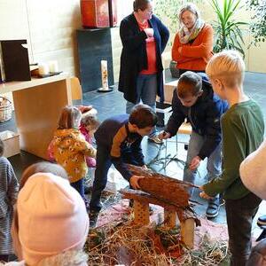 Auch die Kinder setzten dieses Thema bei uns in der Kapelle um und so wurde aus verschiedensten Materialien eine Krippe gebaut. Hier kamen Tannenzweige, Stroh, Ziegelsteine und Tierfiguren aus Stoff zum Einsatz. Das Ergebnis konnte sich auf jeden Fall sehen lassen.