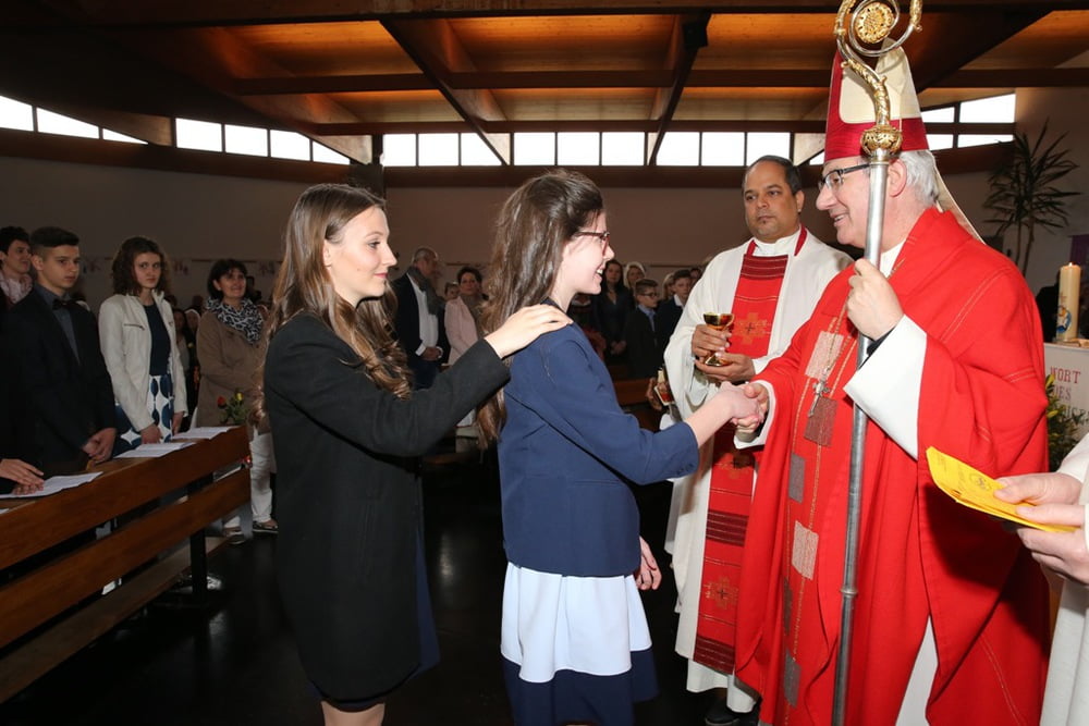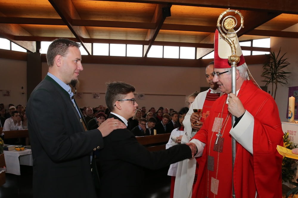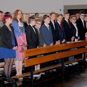 Ein besonderes Flair erfüllte die Kirche, weil Abt Ambros erfreulicherweise eine „Einzelfirmung“ durchführte und Pater Ransom zum Abschluss alle Firmlinge hinter dem Altar versammelte, um gemeinsam mit dem Kirchenchor seine Eigenkomposition „Begeistert von Jesus“ zu singen.