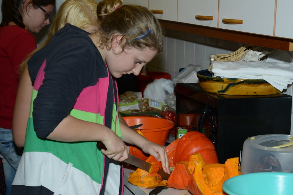 Sehr "bunt" gestaltete sich ein Abend in der Pfarre zum Thema "Herbst" für 37 Kinder. Es wurde eifrig gebastelt: Kürbisse bemalt, Taschen bedruckt oder Mandalas angefertigt. Am interessantesten war für die meisten das Kochen: schälen, schneiden, hacken ..... Das Essen schmeckte dann doppelt so gut. Nach einer kurzen Lichterandacht gingen die Kinder mit ihren selbst gefertigten Produkten zufrieden nach Hause.