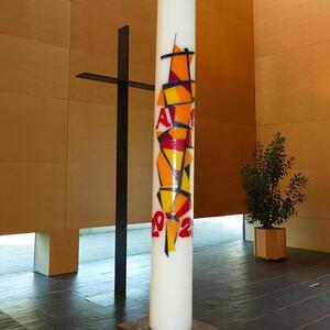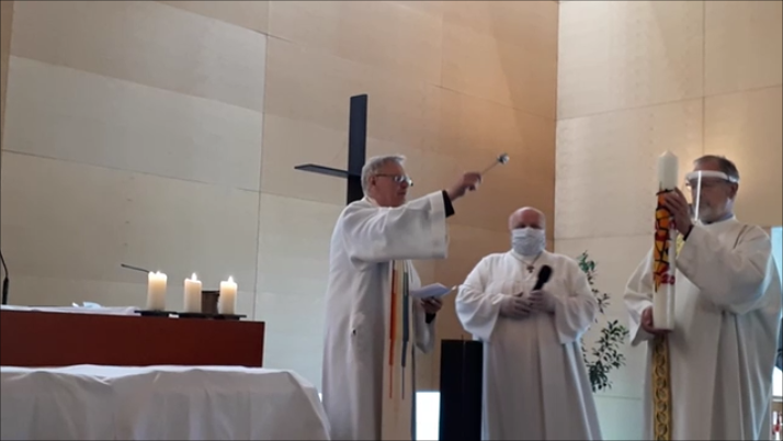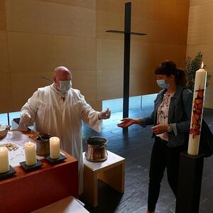 Gleich zu Beginn wurde die Weihe der Osterkerze und des Taufwassers nachgeholt. Begleitet von unserem Organisten Max Schernthaner durften wir sogar drei Lieder singen.