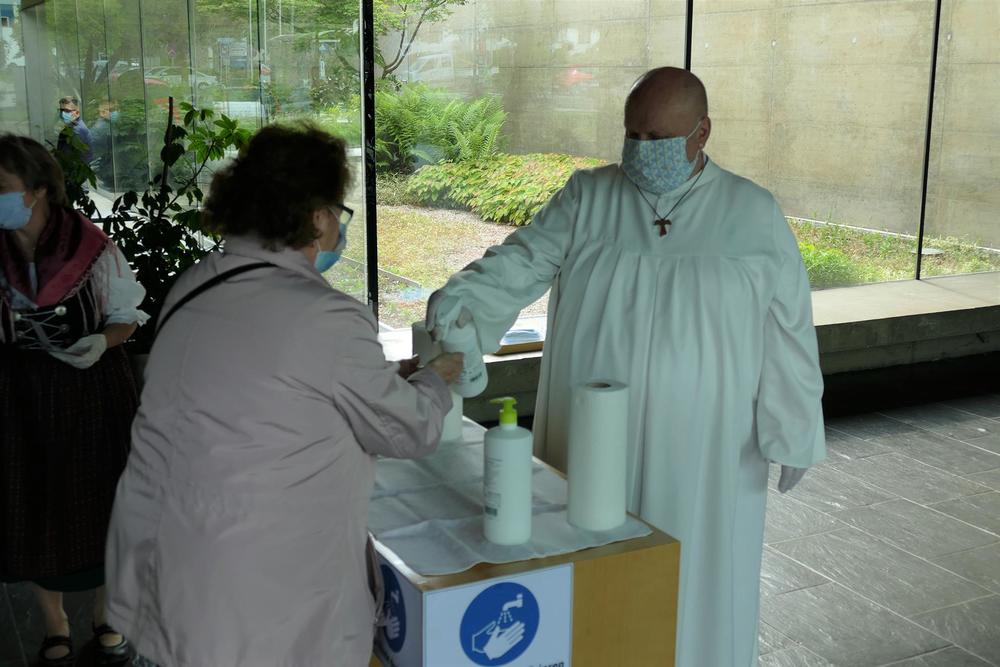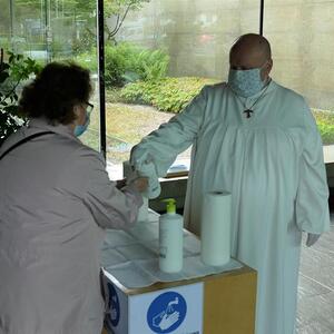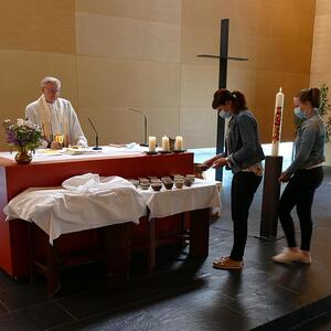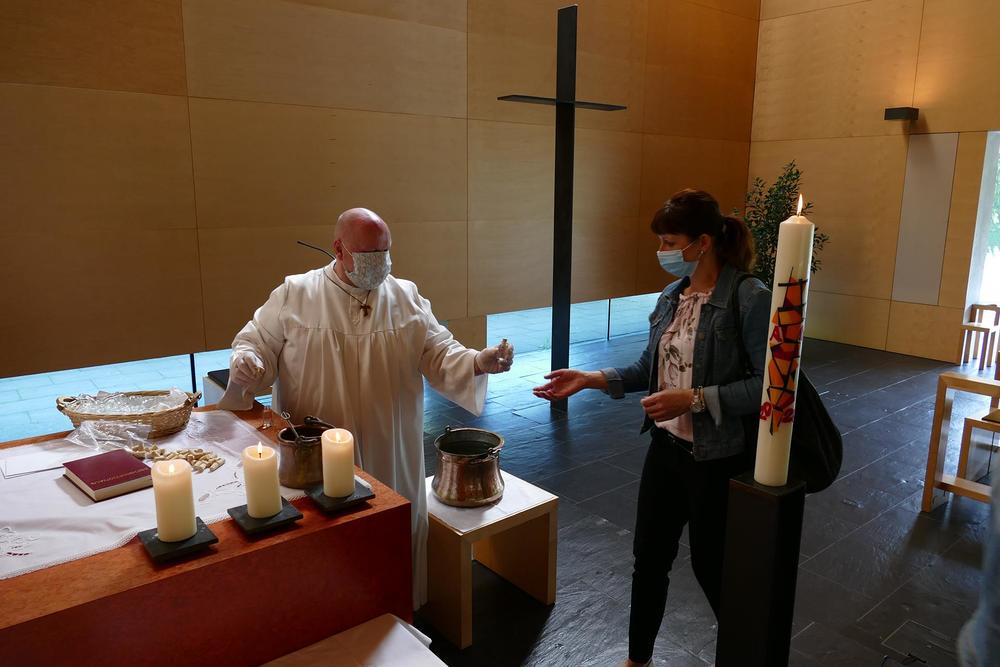 Um den nötigen Abstand bei der Kommunion zu halten, wurden die Hostien heute in kleinen Schälchen vor dem Altar bereitgestellt und jeder durfte sich selbst eines der Schälchen nehmen.