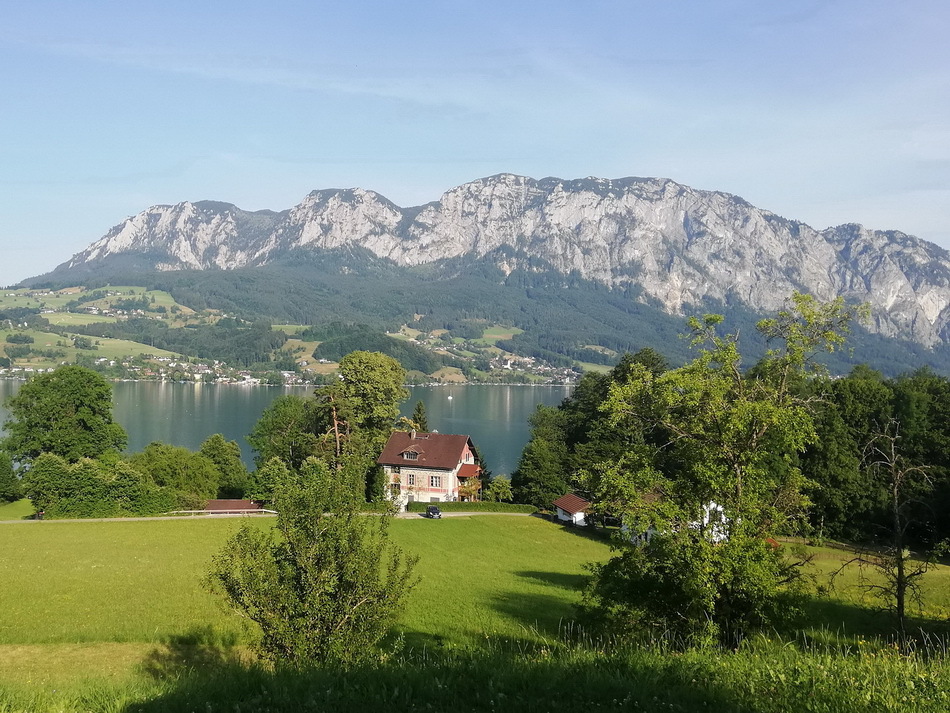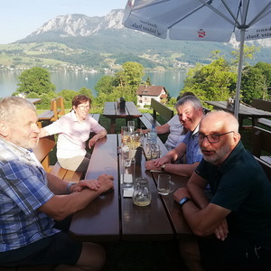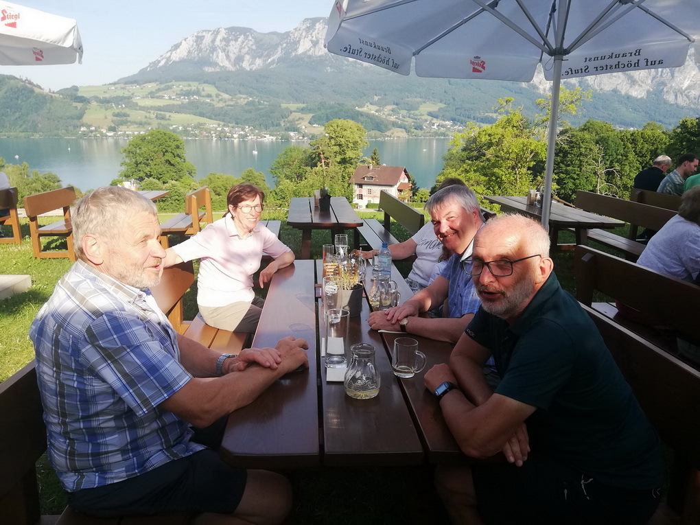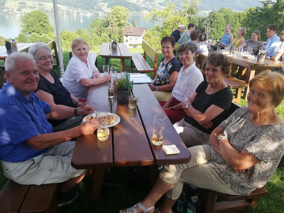 Am Heimweg genossen wir die herrliche Aussicht auf den Attersee und das Höllengebirge bei einer guten Jause beim Mostheurigen Steinbichler in Nussdorf.