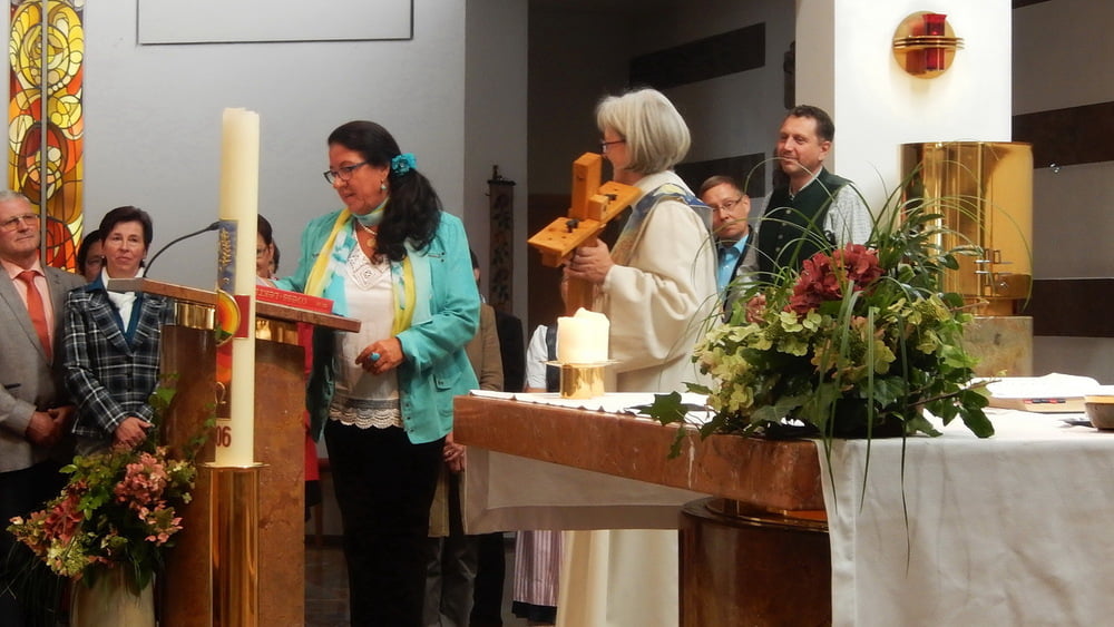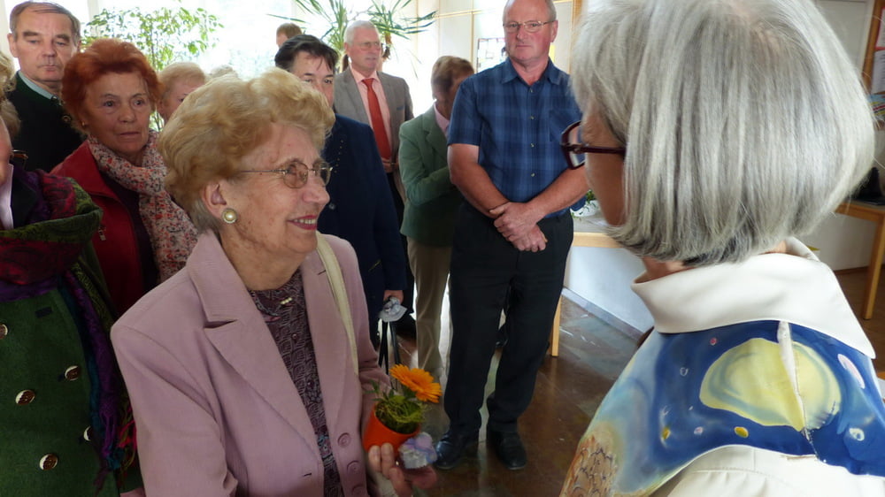 Ein von Rudolf Hutterer im Kleinformat geschaffenes Kreuz unserer Kirche, eine Osterkerze und Blumen waren die sichtbaren Gaben des Dankes an Hildegard.