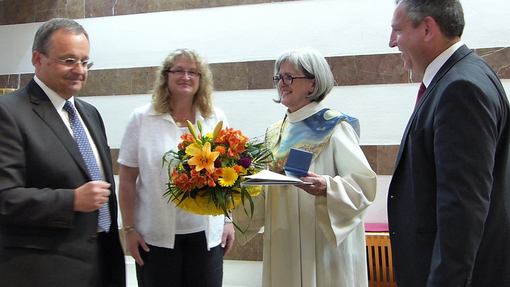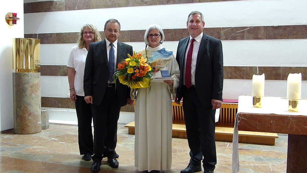 In Würdigung besonderer Verdienste und als Dank für die langjährige, engagierte und erfolgreiche Tätigkeit als Pfarrassistentin der Pfarre Steyrermühl übergab Bgm. OStR Mag. Anton Holzleithner gemeinsam mit Vizebürgermeisterin Maria Ohler und Vizebürgermeister Ing. Fritz Feichtinger das „Große Ehrenzeichen in Silber“ an Frau Hildegard Neuwirth.