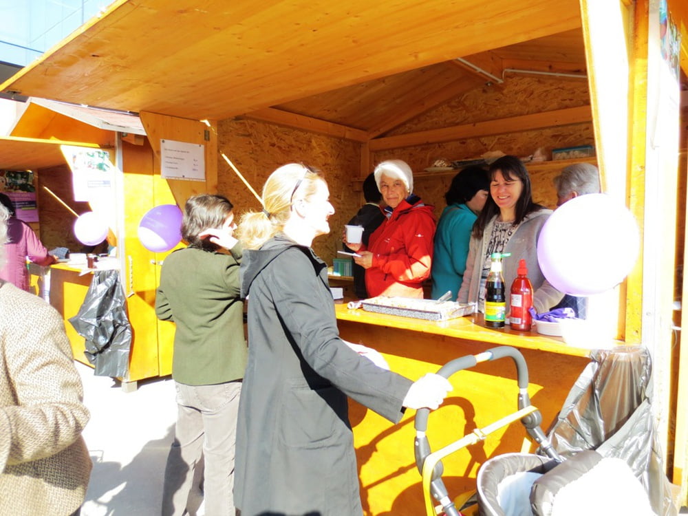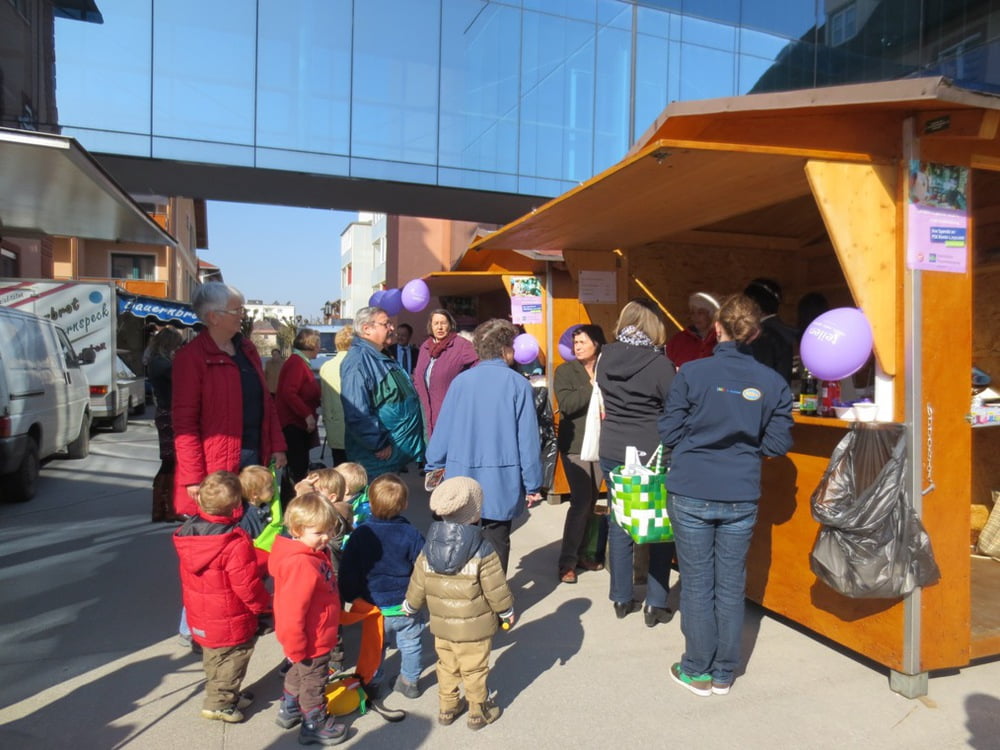 Frauen des Int. Kochstammtisches verkaufen Fastenspeisen am Wochenmarkt Laakirchen.