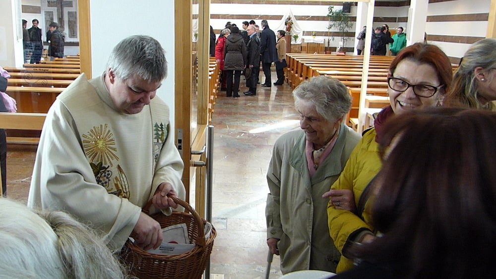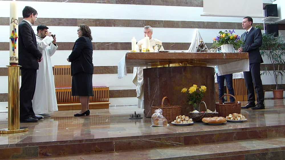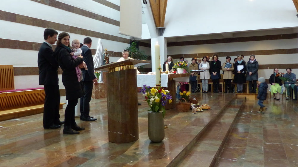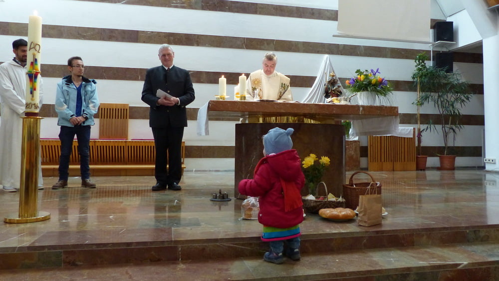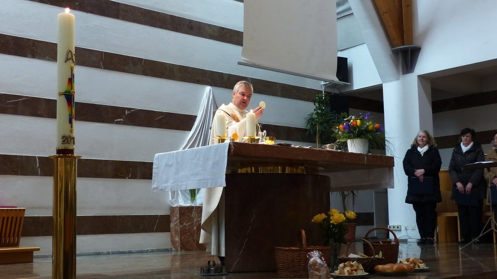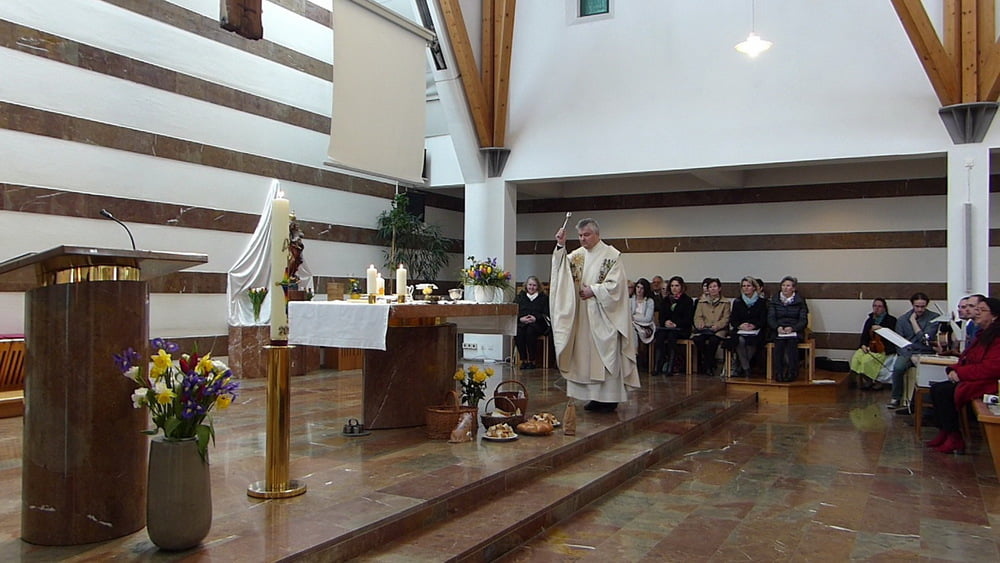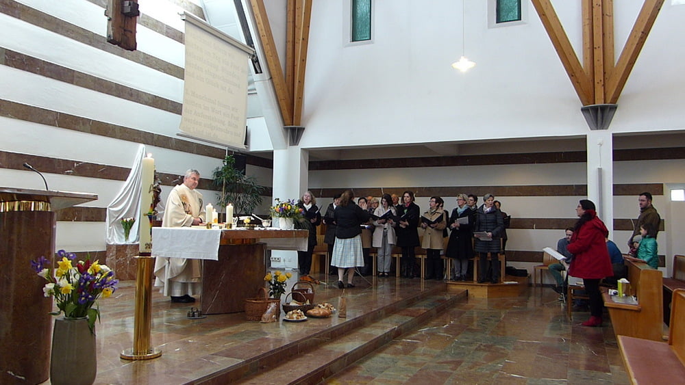 Der von unserem Chor mitgestaltete Gottesdienst klang mit dem Lied "Manchmal feiern wir mitten im Tag ein Fest der Auferstehung" aus - der Herr Pfarrer und Mitglieder des Seelsorgeteams teilten mit den Gottesdienstteilnehmern Osterbrot und Eier.