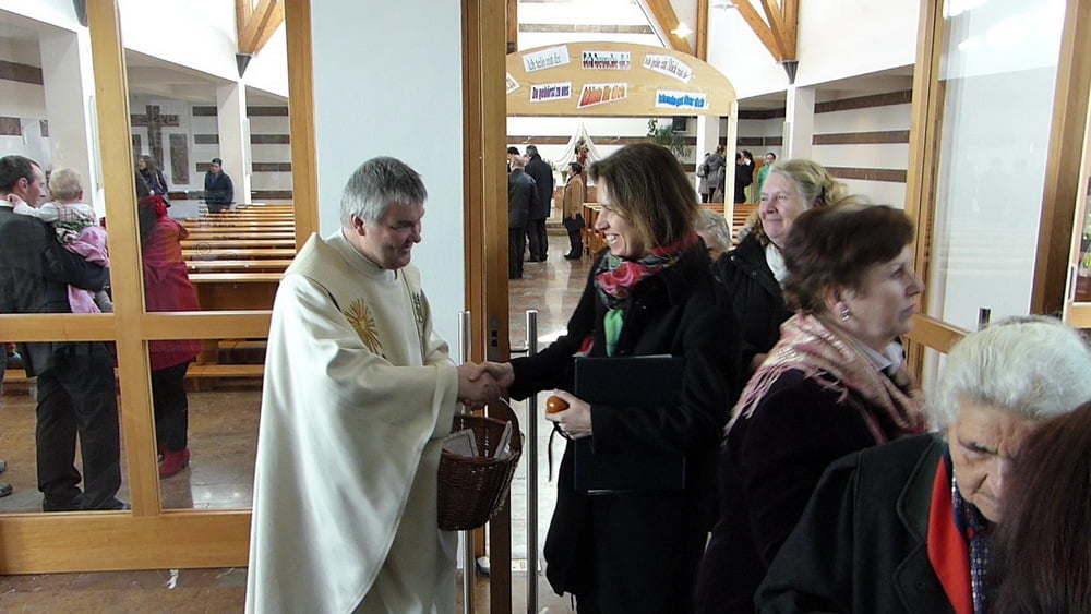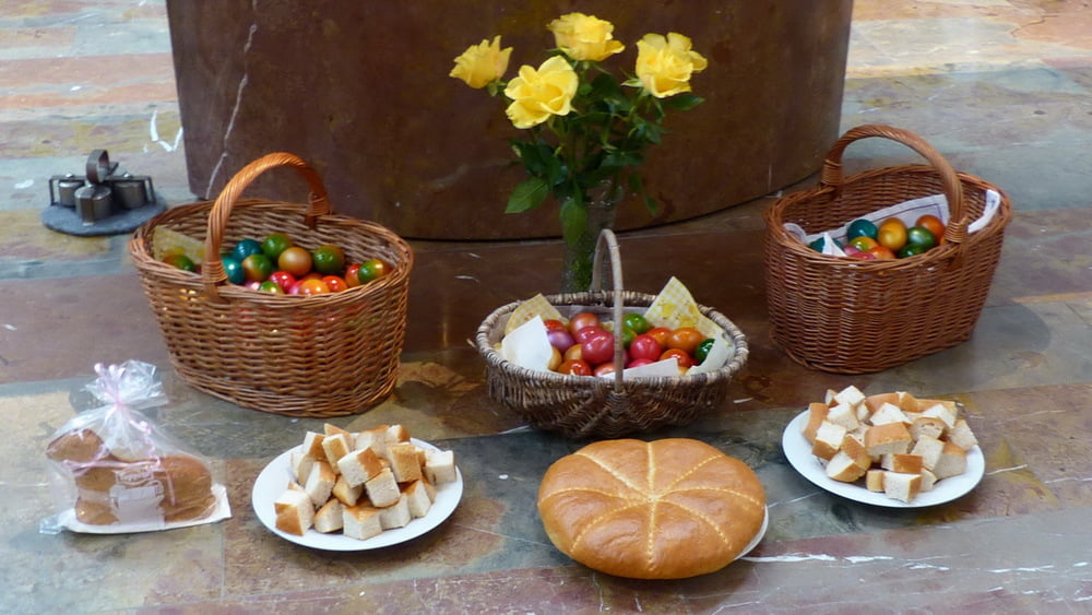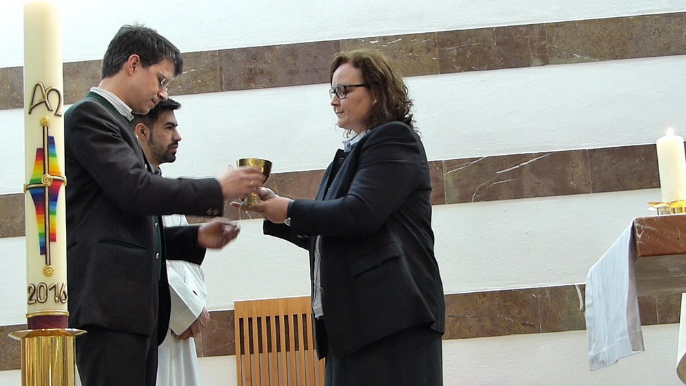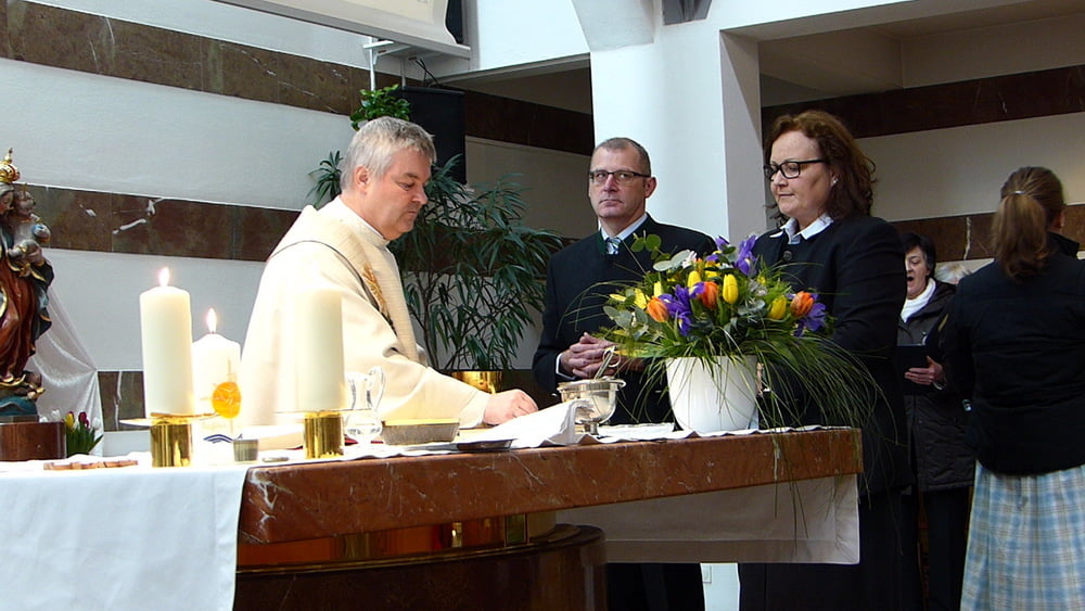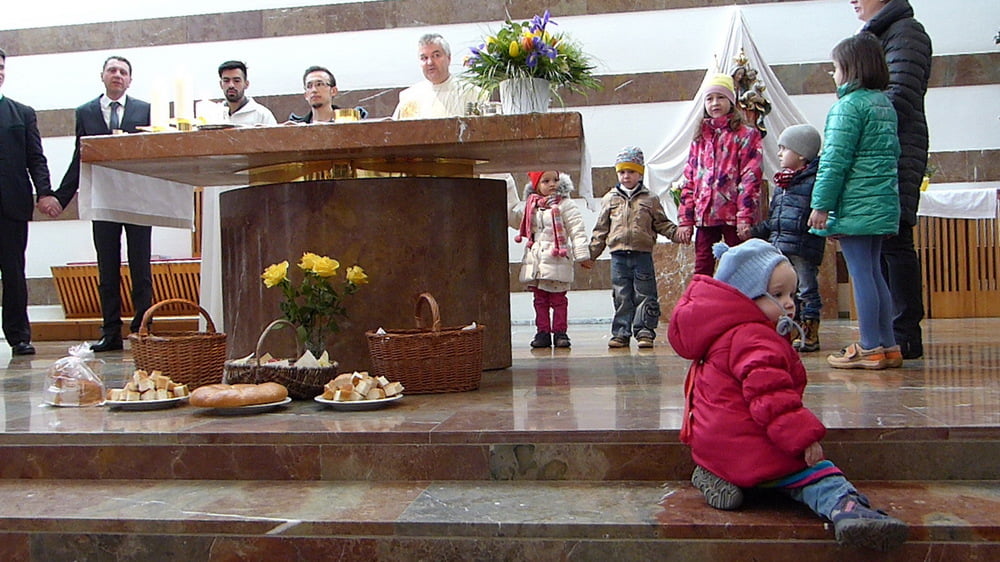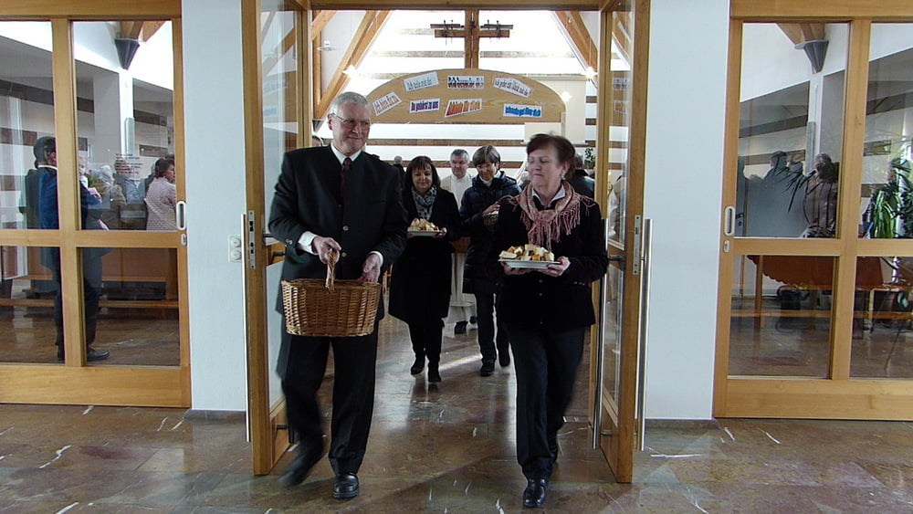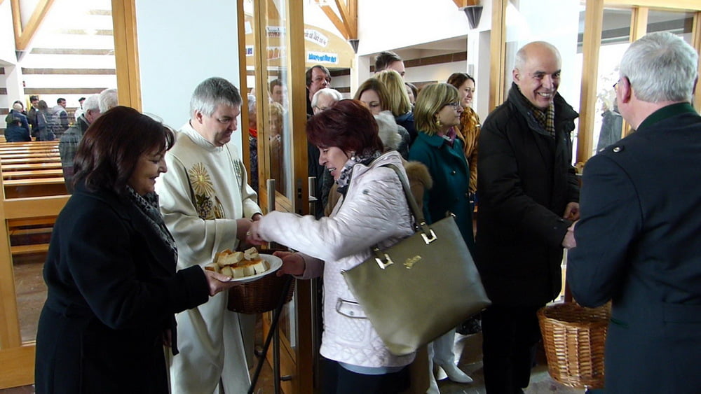 Der von unserem Chor mitgestaltete Gottesdienst klang mit dem Lied "Manchmal feiern wir mitten im Tag ein Fest der Auferstehung" aus - der Herr Pfarrer und Mitglieder des Seelsorgeteams teilten mit den Gottesdienstteilnehmern Osterbrot und Eier.